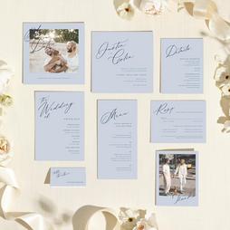 Live the suite life, AKA matching everything. Dusty blue wedding invitation suites are a great way to express your style — create your own with everything from custom save the dates and RSVP cards to menus and programs.