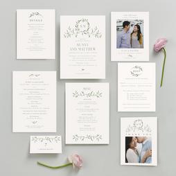 Live the suite life, AKA matching everything. Whimsical wedding invitation suites are a great way to express your style — create your own with everything from custom save the dates and RSVP cards to menus and programs.