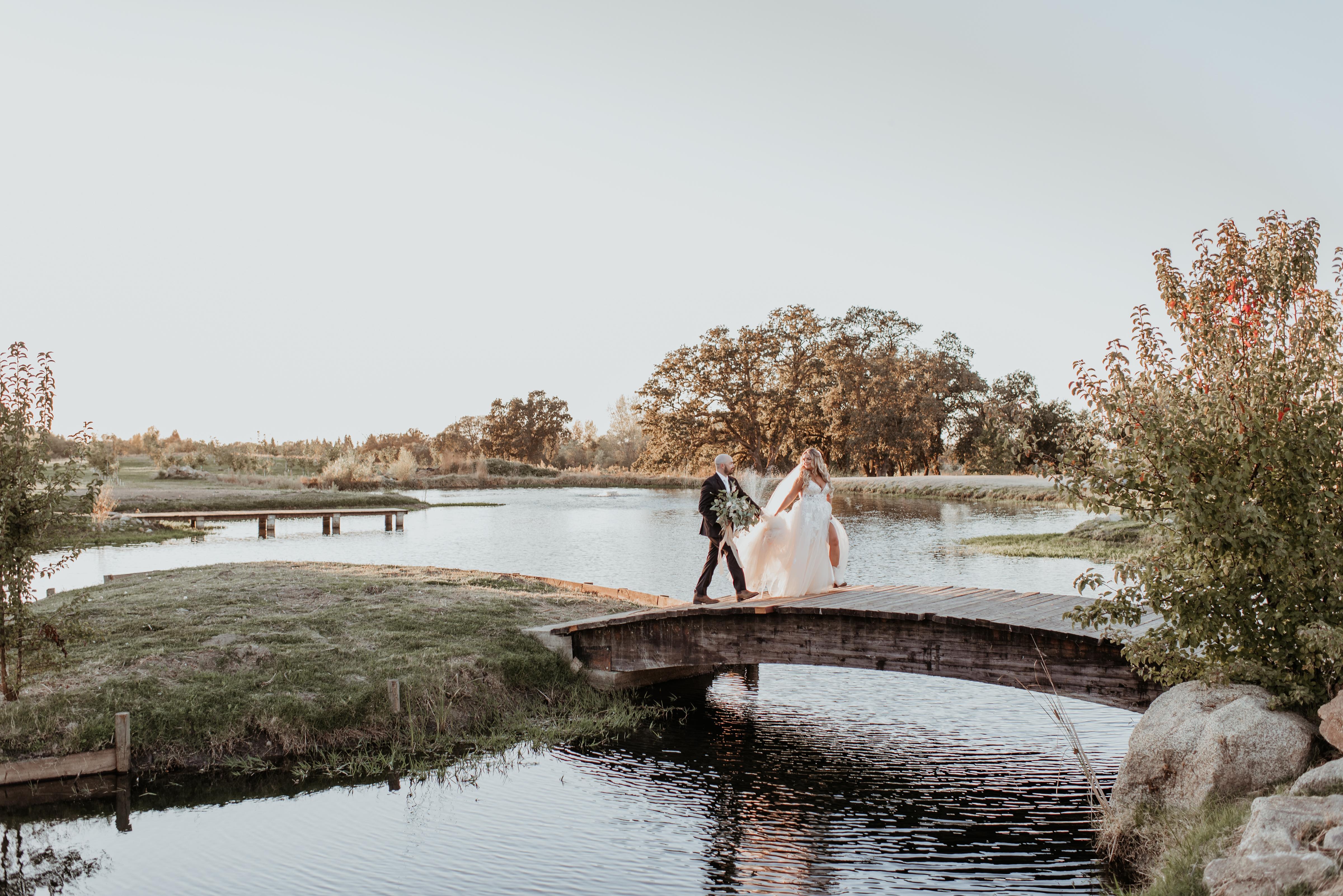 The Barn at Twin Ponds is a rustic barn and outdoor wedding venue located in Lincoln, California. This stunning property is a hidden gem that you don't want to miss out on. There are indoor and outdoor event spaces that you can use throughout your magical day. Infront of the beautiful rustic barn is a giant oak tree which makes for wonderful ceremonies. Cocktail hours takes place outside on our sprawling lawn where you can play lawn games over looking the property pond. Receptions then follow in the rustic yet romantic barn. This space is complete with several chandeliers, traditional barn doors, and wooden beams. This barn has ample space for seated guests, a dance floor, and live entertainment. The venue also has a "Bunk House" located right across from the reception barn that has restrooms, a romantic bridal suite for the ladies and a rustic grooms room for the gentlemen. This venue has it all.