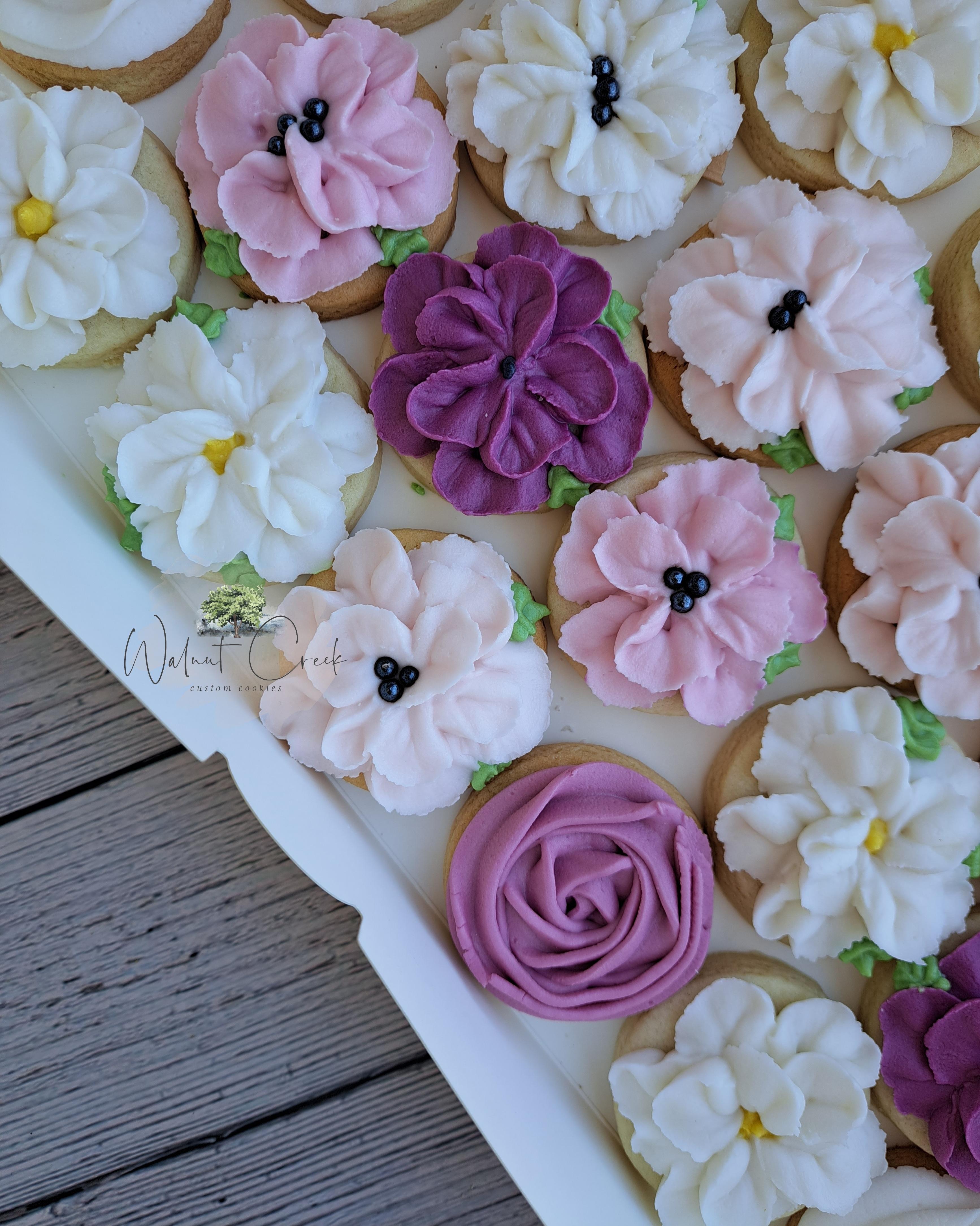 Located in Hobbs, New Mexico (originally based in Millersburg, Ohio) Walnut Creek Custom Cookies is a home-based bakery that specializes in custom-decorated sugar cookies for all occasions. All of our treats are made from scratch, with only the best ingredients. From piping every individual poinsettia flower to the gold accent & assembly of the cookie florals itself - it's all by hand!!