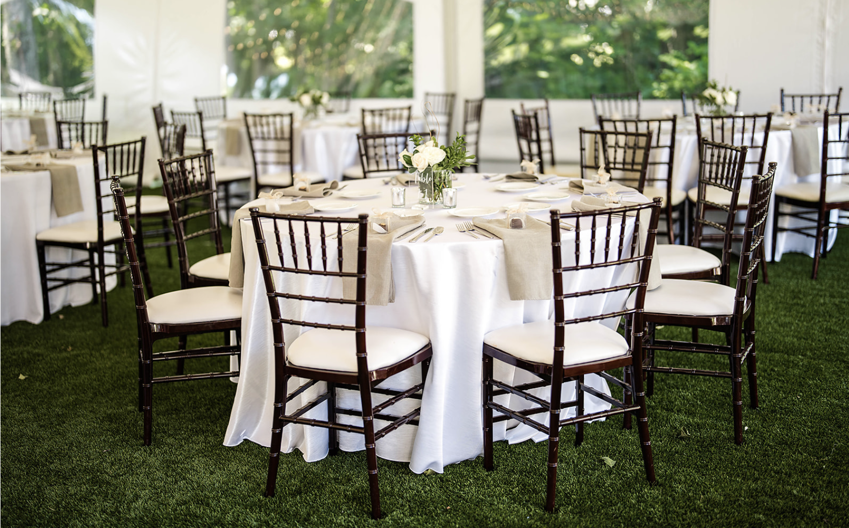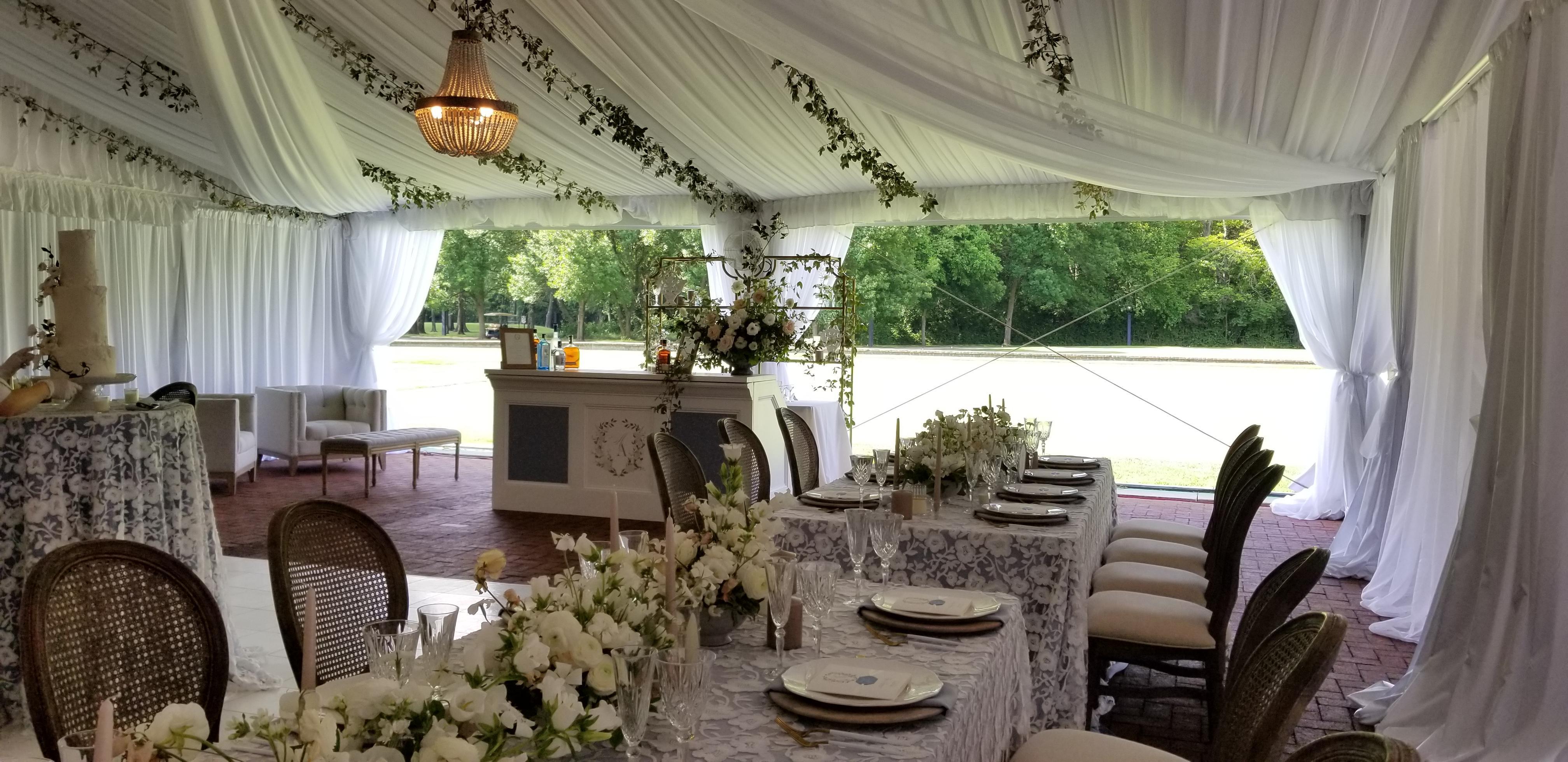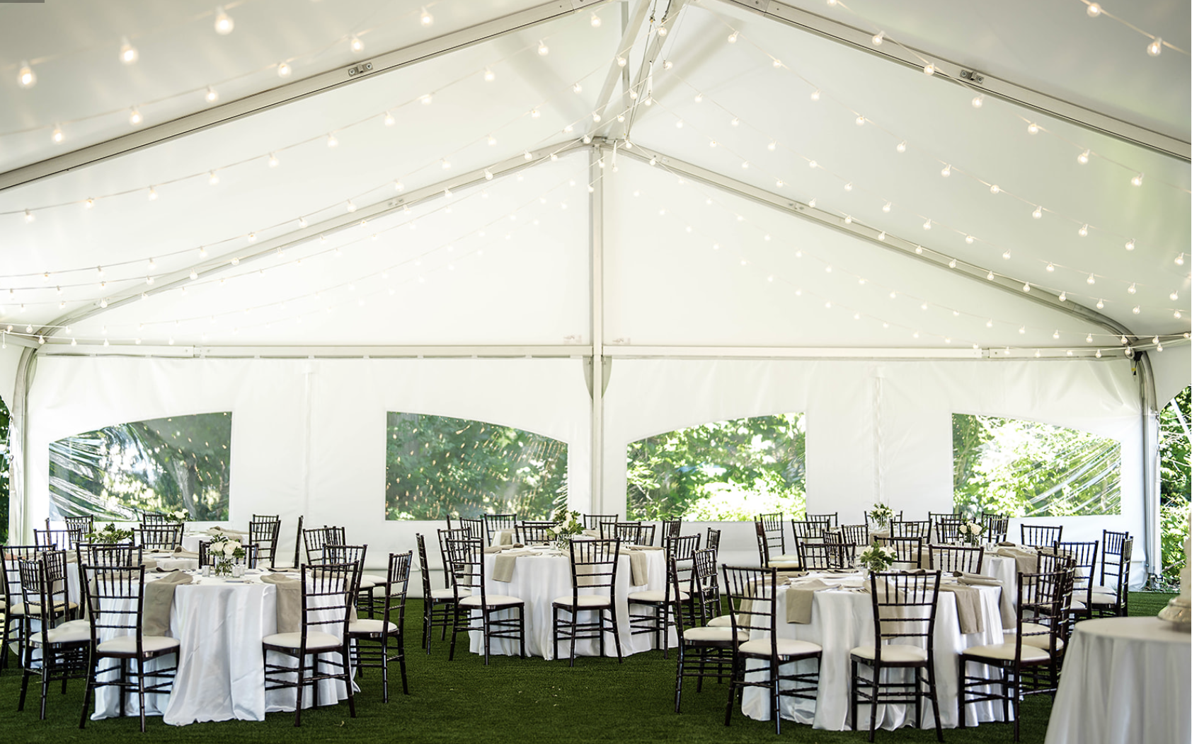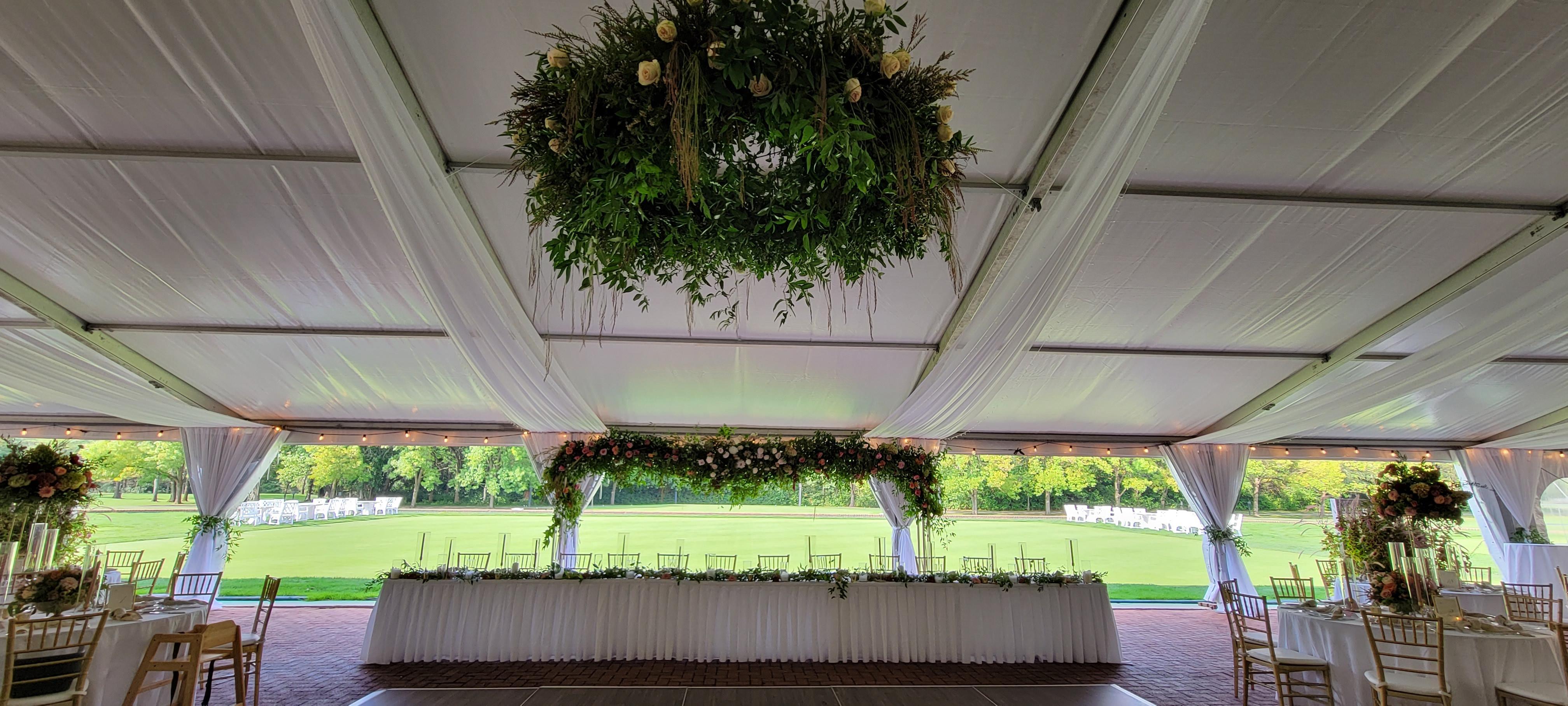 Kinsale is located in Powell, Ohio and our outdoor tented space is perfect for your wedding reception. We are able to accommodate up to 200 guests, include the dance floor and have a beautiful location for an outdoor ceremony. The tent comes with the tables, chairs, flatware and glassware for the event and our standard ivory linens.