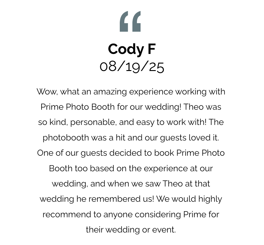 I will say, never needing a Photo Booth vendor before I was a little leary trying to decide how to find one for my Daughter's wedding. I contacted many and never received a response from quite a few! But my email to Prime Photo Booth was the best decision ever! Not only was I able to view real videos of their set up on their social media pages, their communication was fabulous! Their prices are extremely reasonable and well worth it! Theo was an absolute delight and he was so entertaining with our family and friends! I will definitely suggest this business to friends and family in the future! 100%