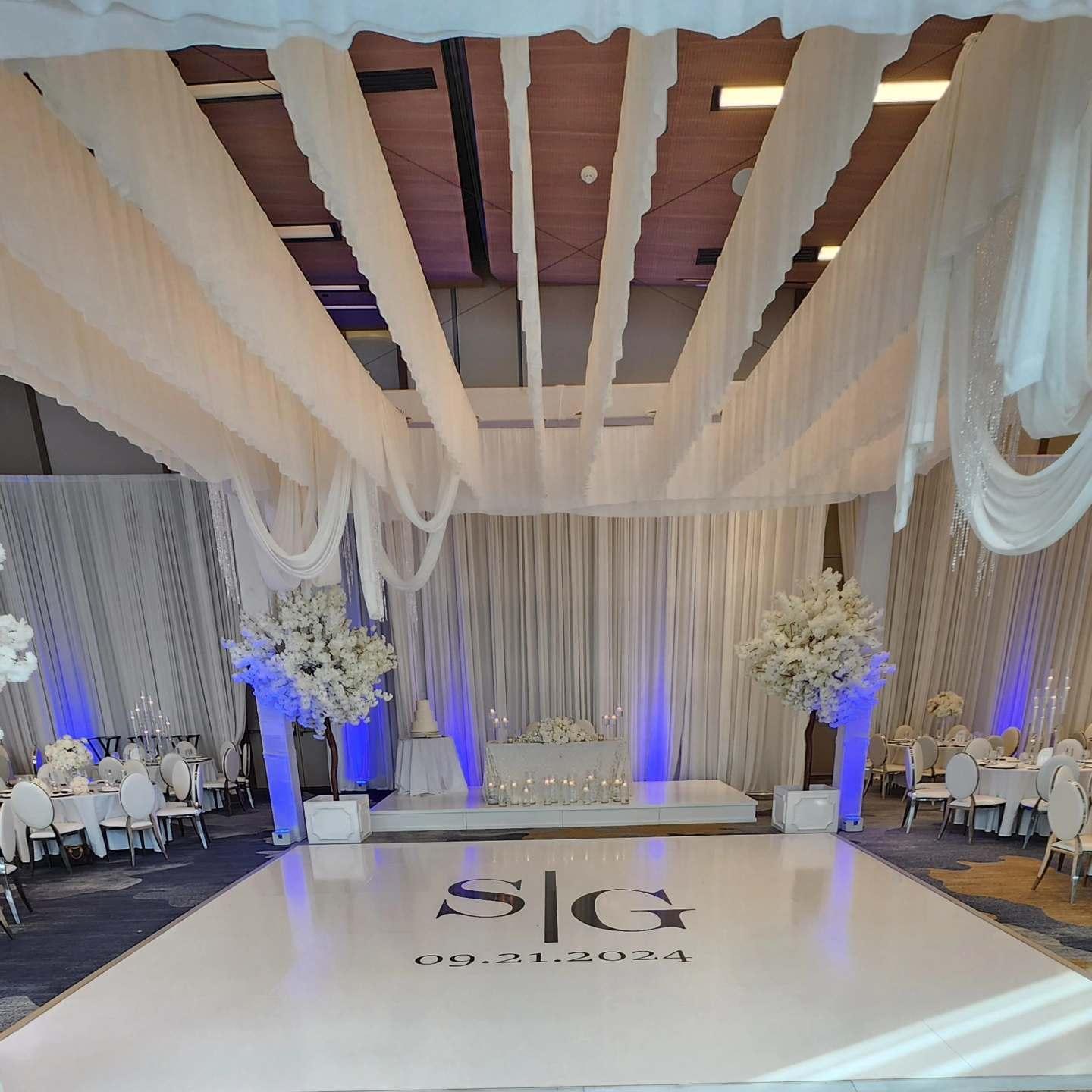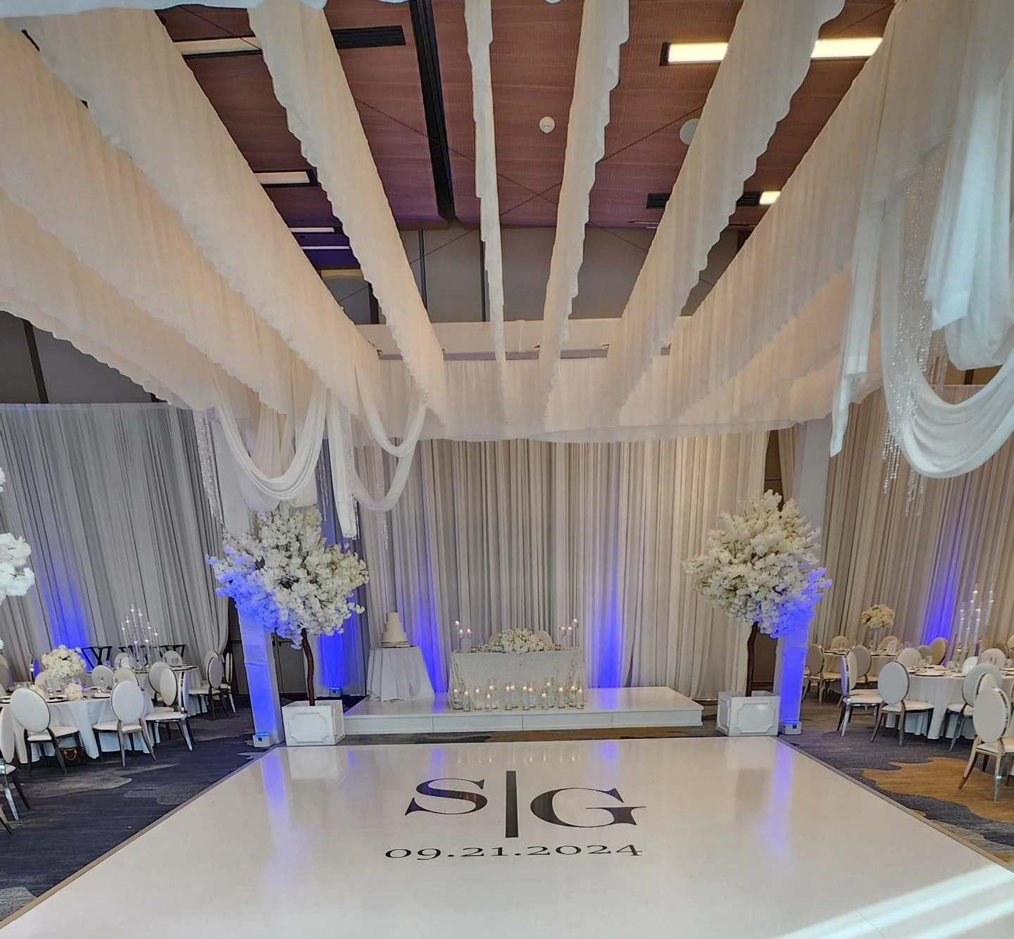 2. Planning of wedding according to client request. 3. Playing all music for prelude, ceremony, postlude, cocktail hour, dinner, dancing, etc 4. All introduction M.C. services. 5. Working with the event staff. 6. Wedding details oriented and wedding questionnaire provided by DJ. 7. Sound equipment up to 3 different locations. 8. Wireless microphones for ceremony and reception. 9. Wireless uplights with lighting effects (additional if needed). 10. Custom Monogram (additional if needed).