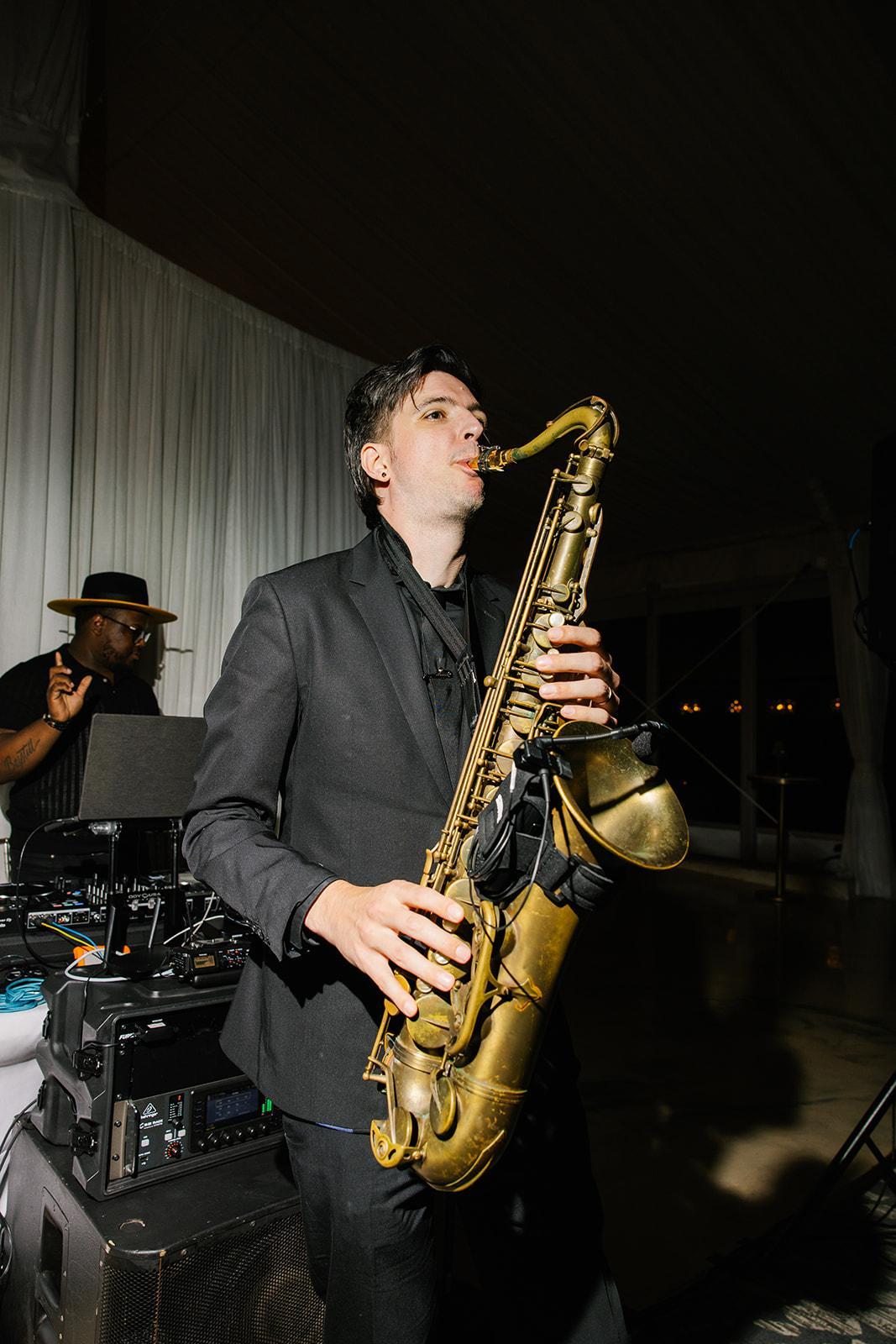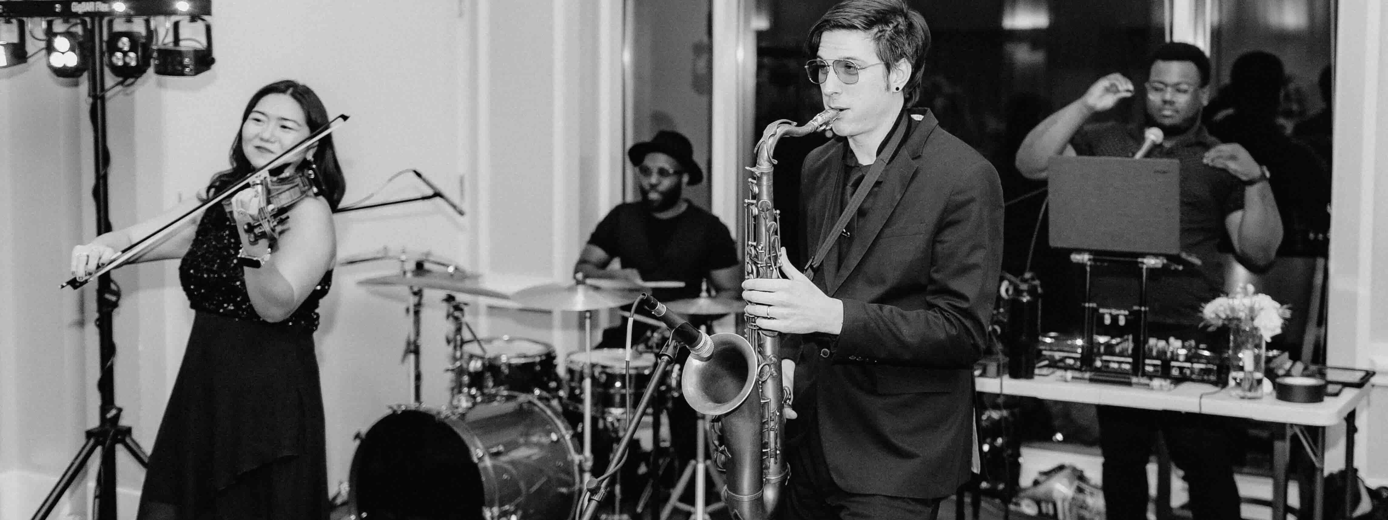 At DJ Hybrid Chicago, we elevate the DJ experience with live musicians, offering you the best of both worlds. Our saxophonist, for example, uses a wireless mic to mingle with the crowd, adding a dynamic live element to the DJ music. We also provide a wide range of services, including Ceremony Strings, Jazz Trios and Quartets, Uplighting, Photo Booths, and more. This blend of live performance and DJ expertise ensures a memorable and engaging atmosphere for your special day.