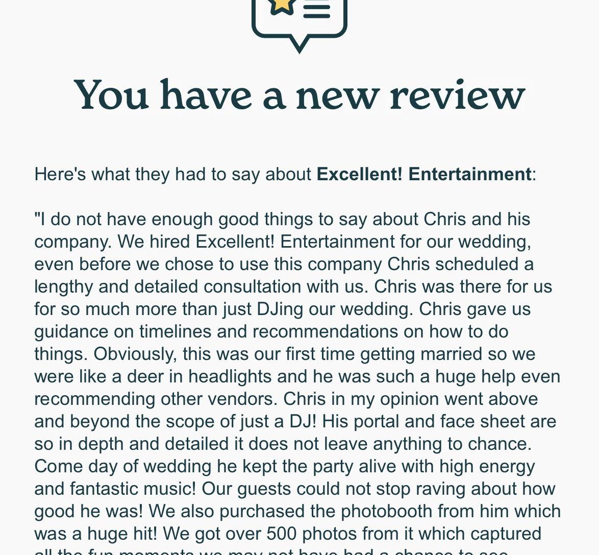 We initially submitted this review in 2024, but we are resubmitting to make sure Excellent! Entertainment gets the credit they deserve. From start to finish, their communication style was detailed, fun, easy, and thorough. The quality of their work and value was perfect, detailed, above average, and excellent. They took care of everything, and we are so grateful to them for making our wedding day one of a kind! Thank you so very much, Excellent! Entertainment.