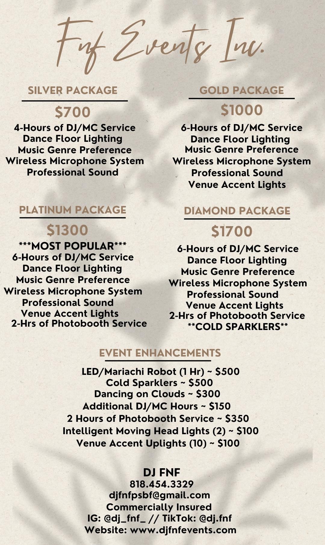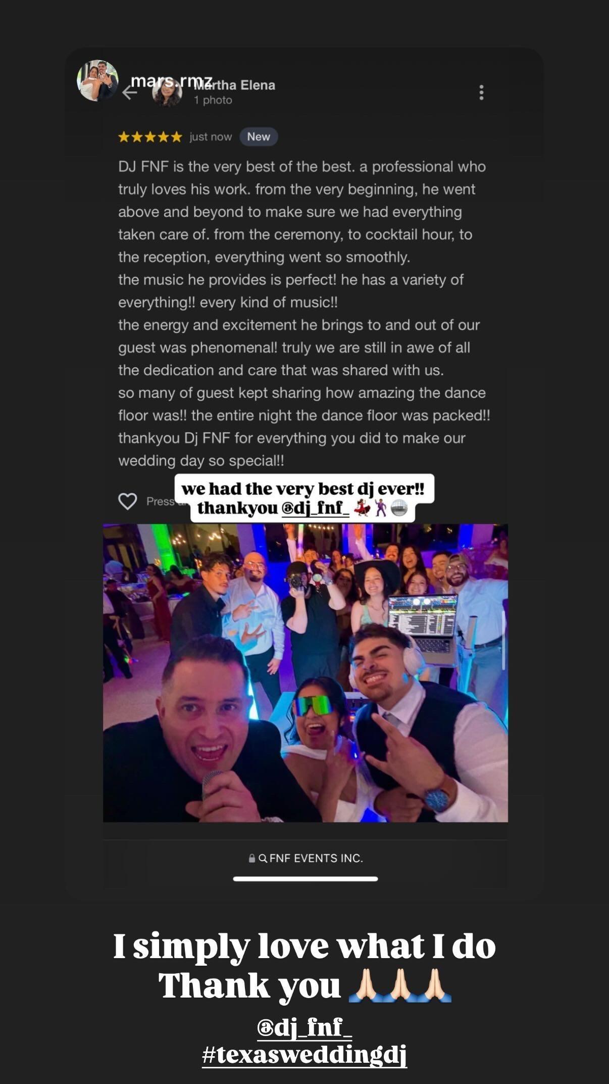 Fnf Events Inc. was a joy to work with for my daughter's dance team banquet. From the start, his communication style was receptive and workable - he listened to our ideas and recommendations, and made the planning process easy and fun. On the day of, Fnf Events Inc. brought a great energy and was highly receptive to the crowd, reading them well and keeping the dance floor full all night. Overall, Fnf Events Inc. was a fantastic addition to our special day and we highly recommend them to any couple looking for a band or DJ that will make their wedding a blast.