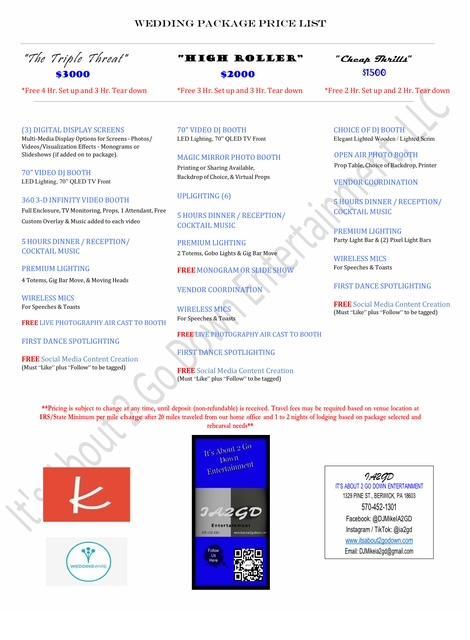 We understand the struggle of planning and finding vendors that don’t want to take advantage of you. That is why we started this business. We want our clients to know, upfront, our prices and options. CONTACT US at: wwwitsabout2godowncom FB: wwwfacebookcom/DJMikeIA2GD/ Insta & Tiktok: ia2gd #ia2gd