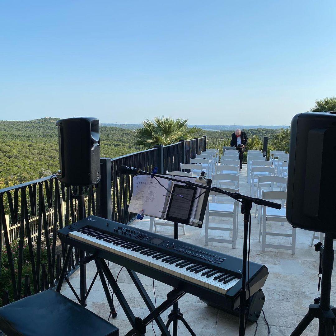 30 minutes pre-ceremony live piano/vocals/guitar 30 minutes ceremony live piano/vocals/guitar and sound management for officiant/bride and groom - family/wedding party processional, bridal processional, and ceremony recessional song requests Wireless lapel mic for the officiant