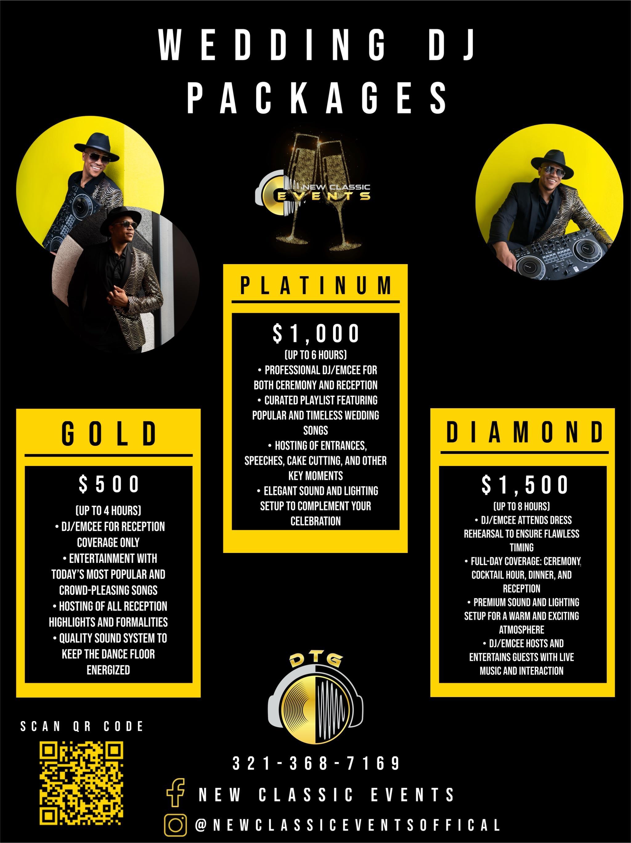 My name is Darien Davis, also known as the remarkable DJ D.T.G. I am the owner of New Classic Events and I have a passion for creating unforgettable weddings. I craft personalized playlists, read the crowd flawlessly, and keep the energy high all night long—making your celebration truly one-of-a-kind from the first dance to the final song. Let me turn your special day into an epic party your guests will talk about for years!