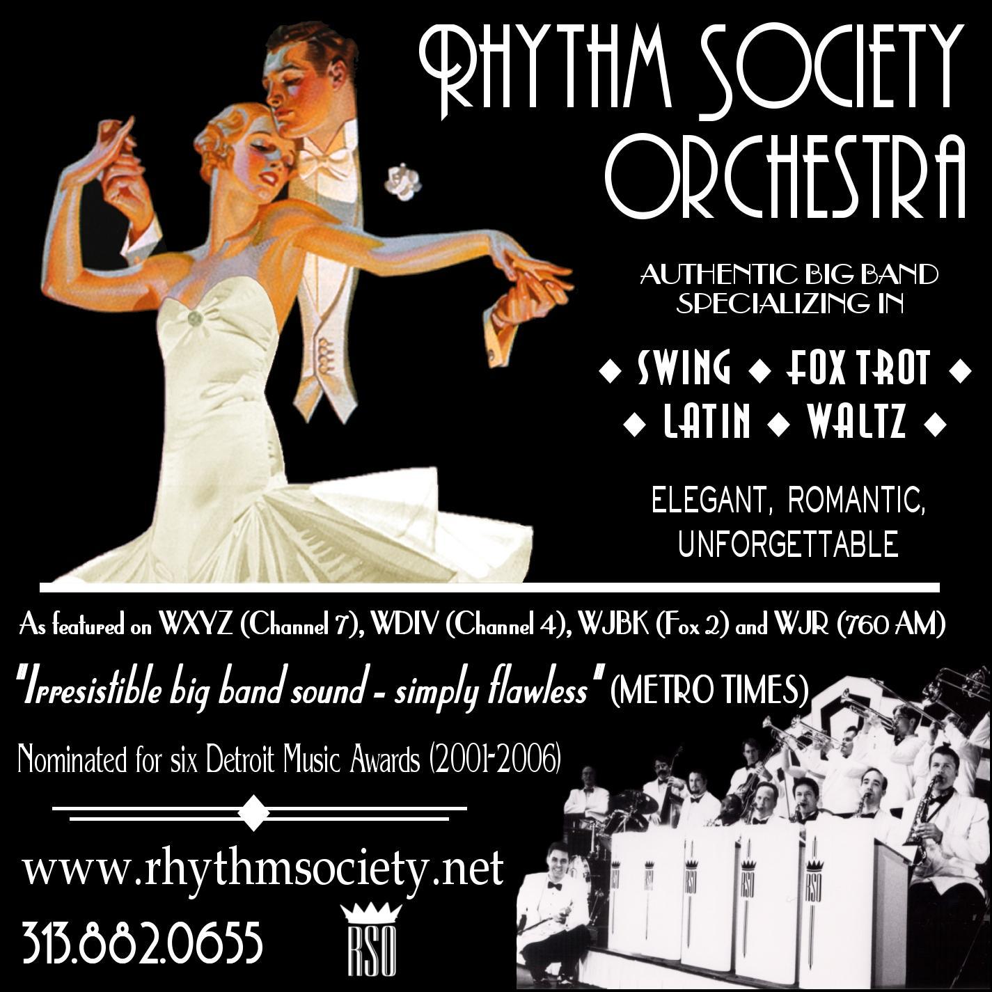 Rhythm Society Orchestra is a 16-piece big band specializing in vintage swing music of the '30s and '40s with a good helping of later Sinatra and friends, authentically re-created. It's music as people remember it and want to hear and see it performed. Classy, professional, experienced and turn-key! We're as sharp looking as we sound, too. Booked by the best hotels, country clubs, agencies, wedding planners, municipalities, historic locations, corporations, philanthropic and wedding receptions (the latter are a specialty!) Add our jazz combo for cocktails, solo pianist for dinner, etc. Top shelf, high-energy entertainment.
