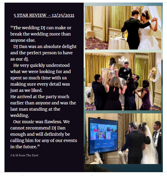 I had multiple long calls with Dan leading up to the wedding. These calls were to get to know us as a couple, what kind of music we liked, details/timeline for the day, etc. Dan asked that we put together a playlist for him, as well as send him our processional and recessional songs, which we did. I had extremely high expectations based on the conversations, but the wedding reception left much to be desired. The ceremony music/sound was great, but the reception music was awful. So awful that people still joke about our horrible wedding music. None of the songs we had on our playlist were played during the reception (except one). I kept sending my guests/siblings/bridesmaids up to the DJ booth to find out when my music would start, and they told me Dan was purchasing songs on iTunes to play at my reception. The music that wasn’t requested was a bad mix of 2010s pop music, with some repeat songs. For a professional DJ and 1200 I expected that he might have a nice mix of songs set up inspired by my playlist, or even just a Spotify premium account. Instead we got bad music with no mixing, dead silence between songs, and no one dancing. It would have been better to rent equipment and have my brother play a playlist from his phone. Big disappointment for us and big disappointment to my dad who paid the cost.