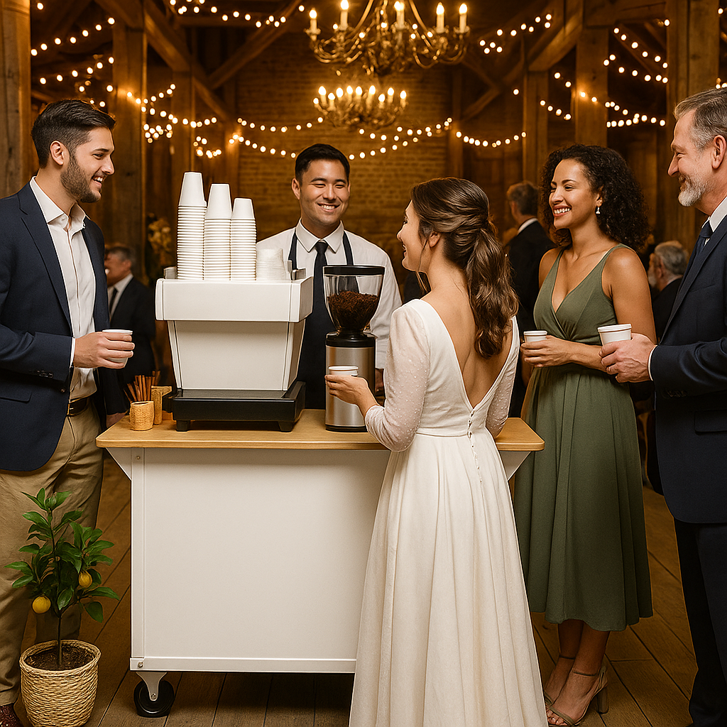 Elevate your wedding celebration with four hours of artisan coffee service for up to 150 guests. Our professional barista creates handcrafted lattes, cappuccinos, and seasonal specialties that keep the celebration energized from ceremony to reception. We handle everything from setup to cleanup, so you can focus on your guests. With unlimited specialty drinks and premium milk alternatives, everyone leaves caffeinated and delighted. Because grand celebrations deserve exceptional coffee.