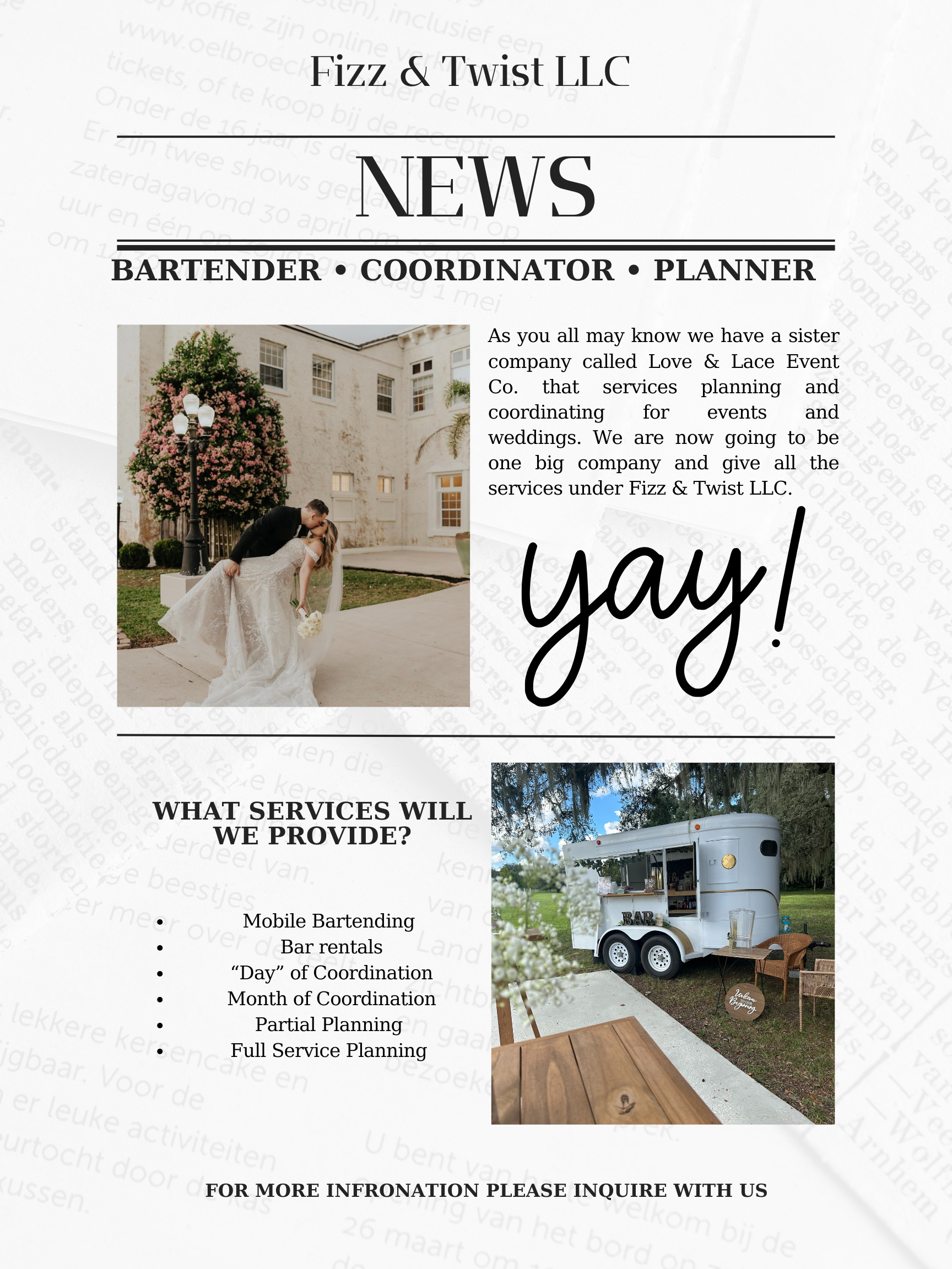 Hiii!! My name is Angely and i am the co-owner of Fizz & Twist LLC. We are a mobile bartending business specializing in weddings. We also provide wedding planning and coordinating services. Let us take care of all the stress while you have the best day of your life!