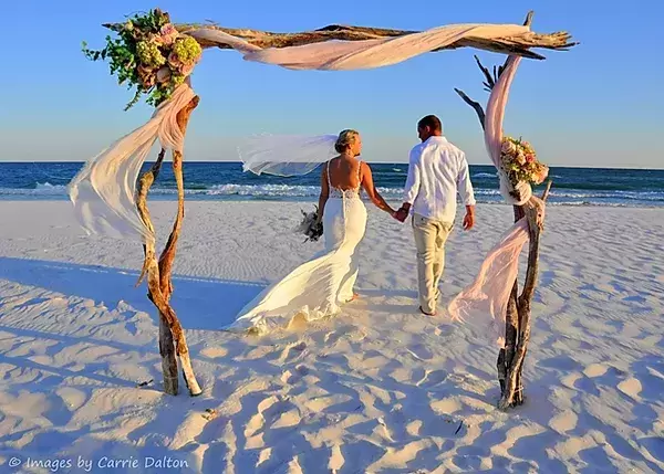 coastal soiree' Intimate beach ceremony with our exclusive driftwood arbor shell blessing Rose petal Walkway Seating for thirty with our white chairs lanterns Minister with custom vows Reception decor with bistro lighting including 5 tables and tablecloths, runners, and centerpieces with lanterns with greenery mini cake for cutting Creamy Artichoke on Crostini Fiery Garlic Shrimp with Lemon aioli Caesar Salad and Caprese Proscuitto Chicken Cheese Ravioli with Rigatoni with Sunday Gravy
