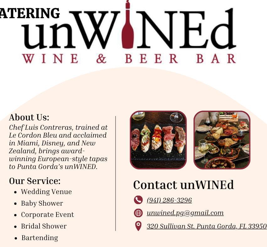 We have partnered with unWINEd, located in the iconic Orange House on Sullivan Street in historic Punta Gorda, UnWINEd brings a unique and inviting experience to your event. Chef Luis Contreras, trained at Le Cordon Bleu and acclaimed in Miami, Disney, and New Zealand, brings award-winning European-style tapas to Punta Gorda's unWINEd. Service: • Wedding Venue • Baby Shower • Corporate Event • Bridal Shower • Bartending Let us uncork and unWINEd together to make your event truly memorable.
