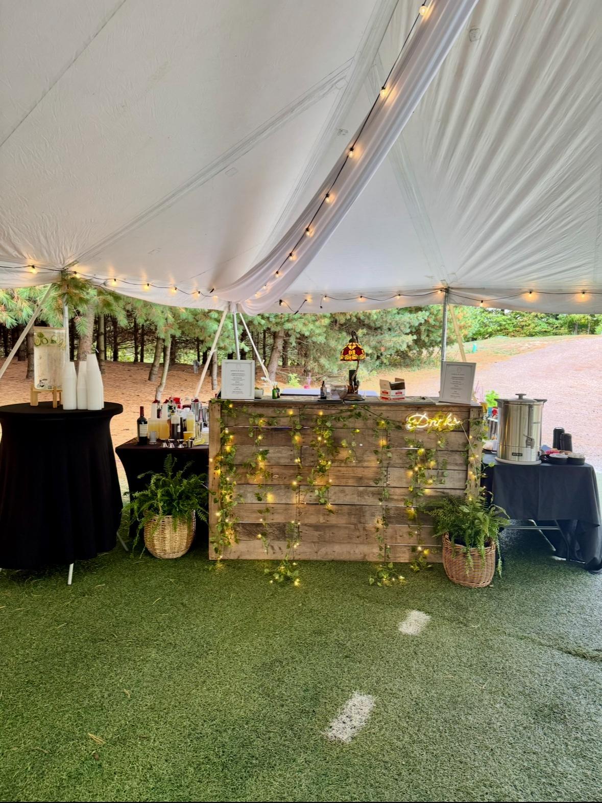 50 People or less, Our Mobile Bar Top, Cups, Straws, Drink Presentation & Garnishes, Spirits, Wine, Beer Service, Two Signature Craft Cocktails, Flavored Water Station, Two Certified Bartenders, Specialty Ice