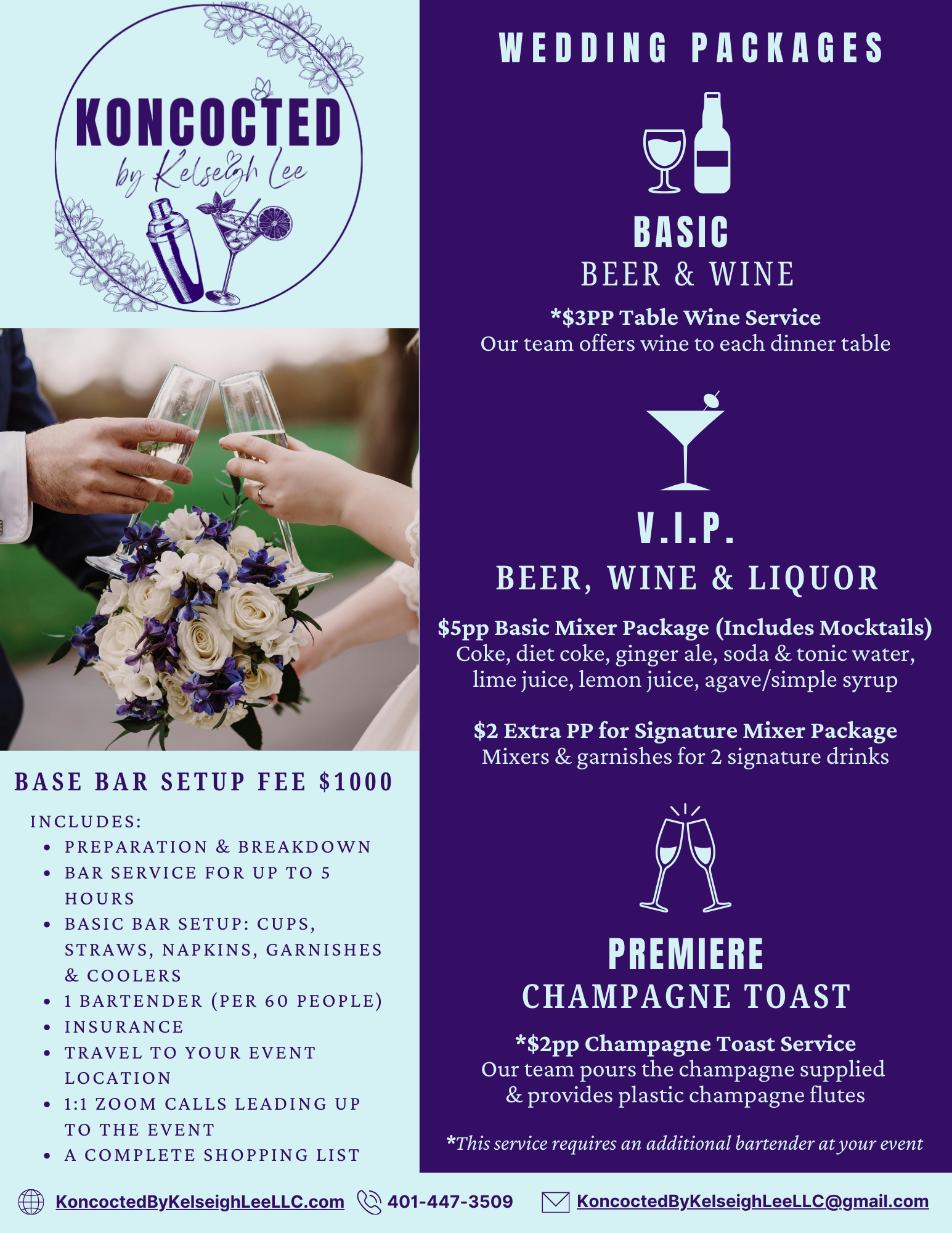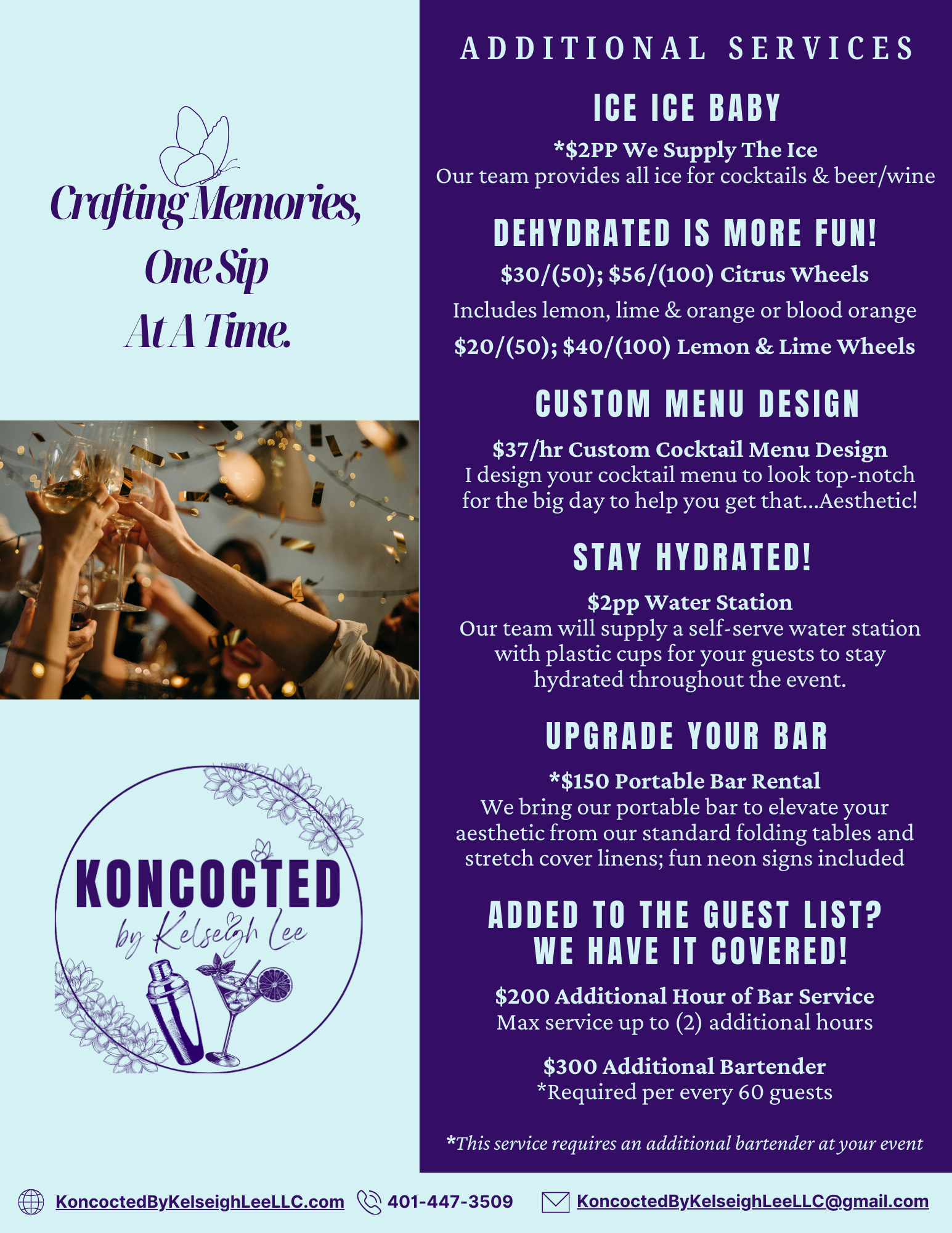 I am so happy you are here! Koncocted By Kelseigh Lee LLC is a Woman-Owned Small Business offering Dry Hire Mobile Bartending & Mocktail services for private events to clients located in MA, RI, & CT. Custom design services are also available at a discount to our clients. Any occasion is welcomed!