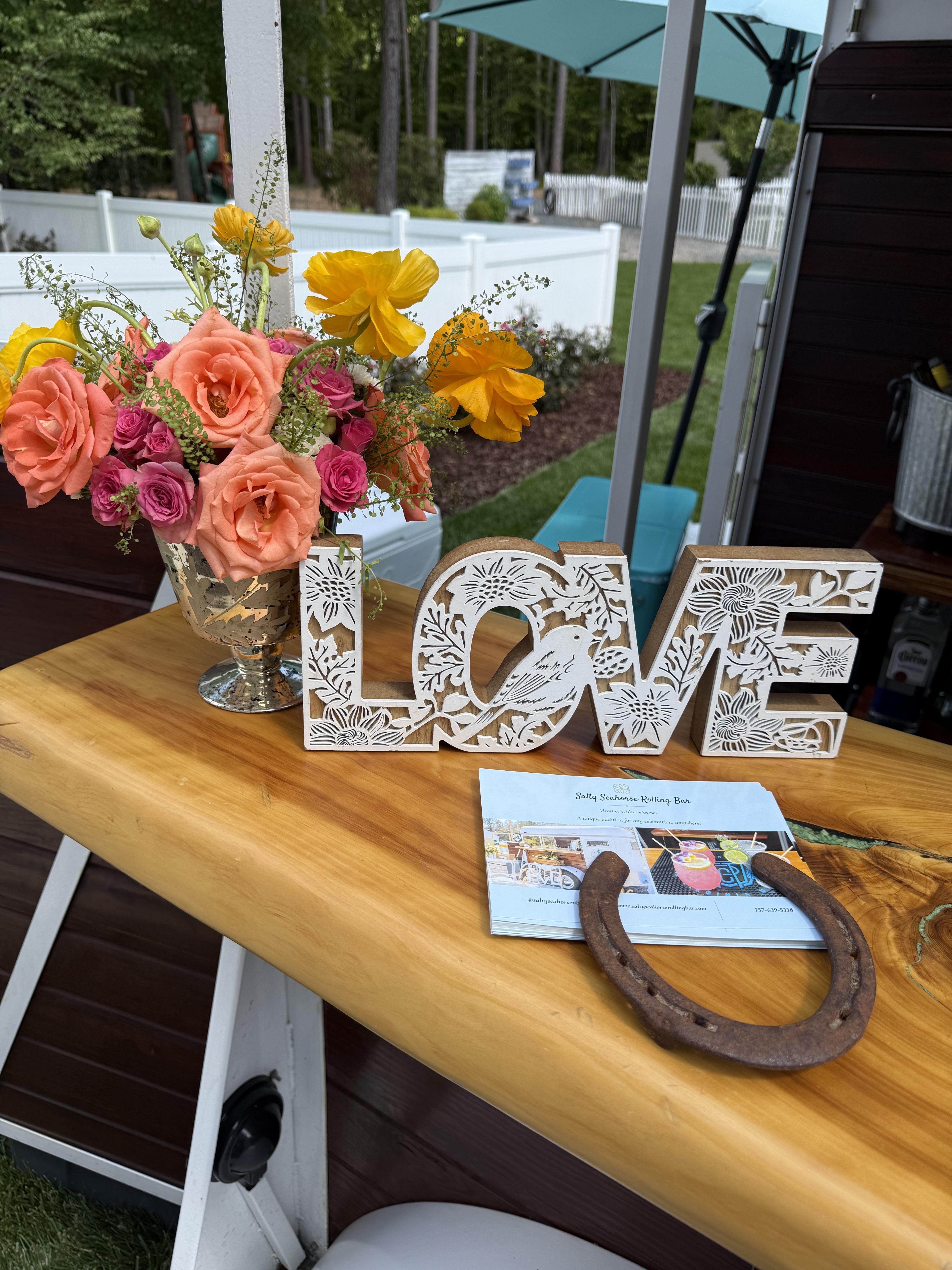 A unique addition for any celebration, anywhere! Salty Seahorse Rolling Bar is a vintage horse trailer converted into a charming mobile bar service for weddings and private functions based out of Virginia Beach, Virginia. It features a stunning raw edge service bar that has been inlaid with crushed turquoise and offers 2 taps for kegs of choice or batched cocktails.