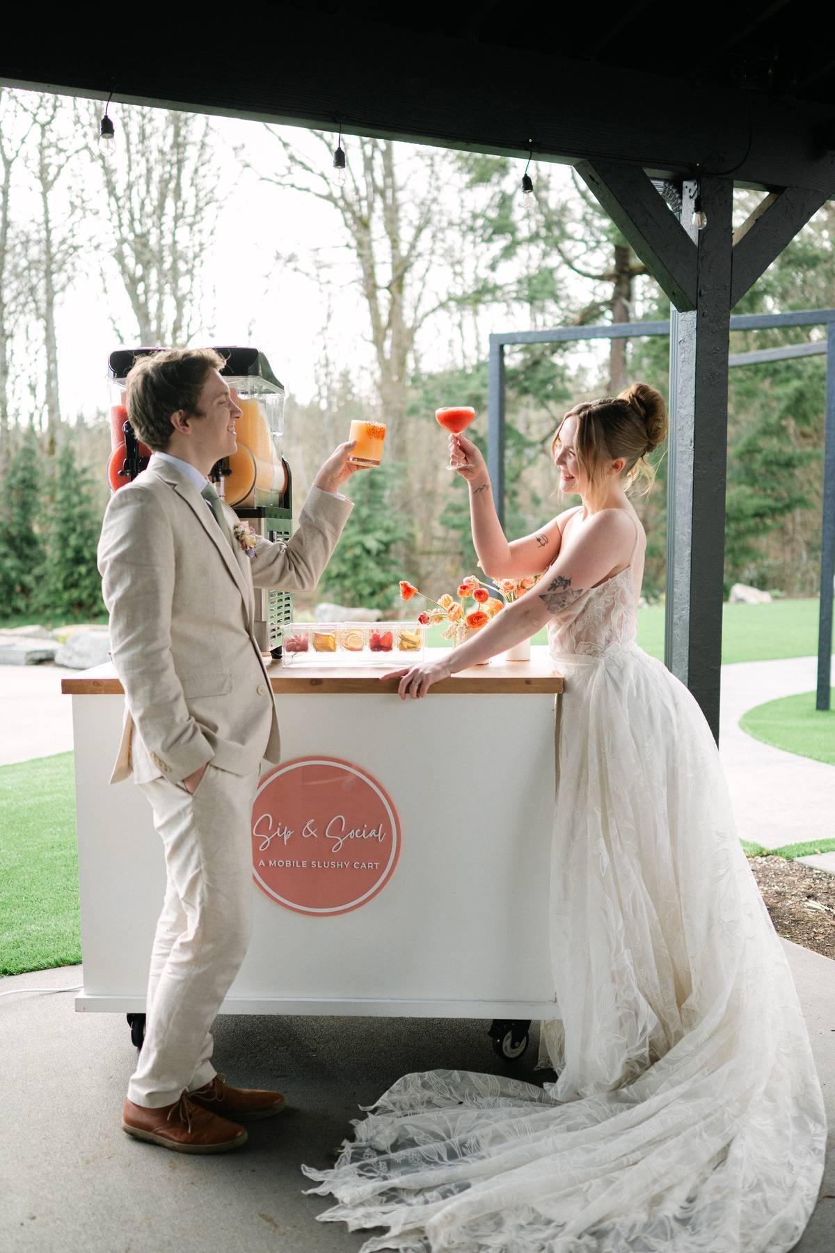 We are proud to be the first mobile slushy cart in the entire region! Our chic aesthetic and delicious frozen drinks are the perfect fit for your wedding, bridal shower or rehearsal dinner, and are guaranteed to be the highlight of your event. Our cart makes the most adorable backdrop for photos too! Our services come with rental of our custom built mobile bar, OLCC/MAST certified servers, your choice of cocktail/mocktail slushy flavors, garnishes/rims, cups, straws, napkins, delivery, and full setup and cleanup. We are currently serving the Portland Metro area, Willamette Valley, Oregon Coast, the Gorge and Southern Washington.