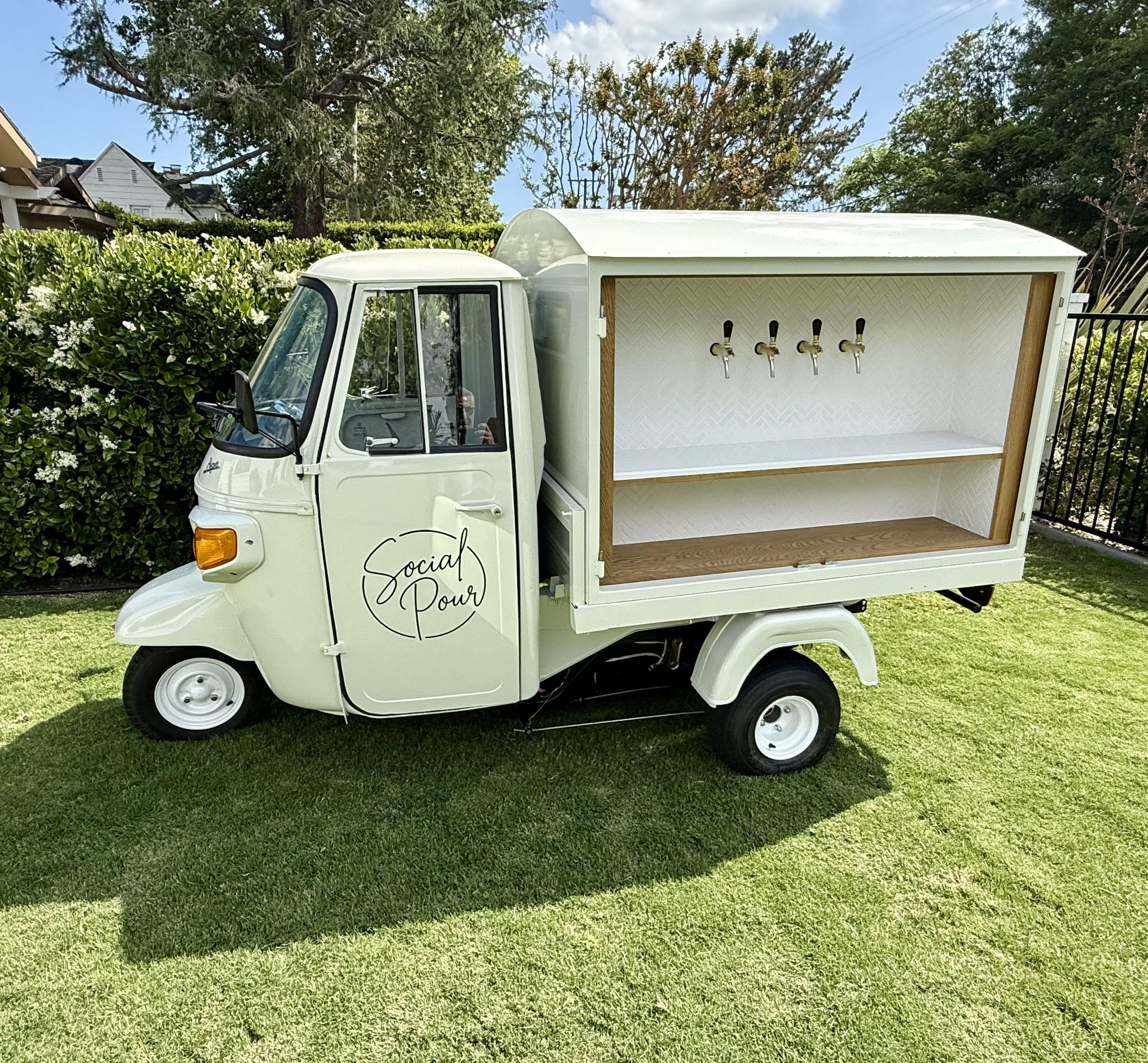 Rates starting at $950 for a 3-hour minimum. Our Italian Piaggio Ape features 2 taps to serve Prosecco, wine, craft beer, cocktails, or non-alcoholic options of your choice. Service includes 1 taptender (an additional taptender is required for events with 100+ guests), along with disposable cups, napkins, and garnish. We handle full setup and breakdown, ensuring a seamless and stylish bar experience for your celebration.