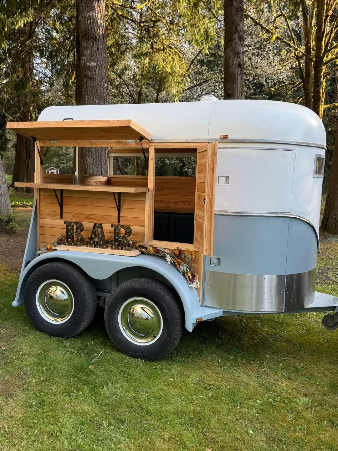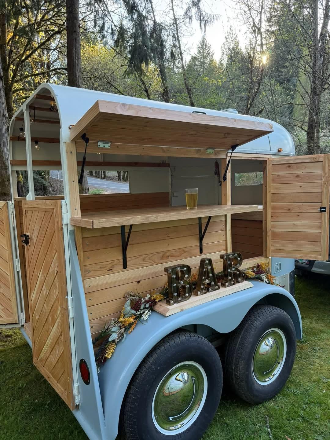 We are a mobile bar available for weddings or other events! We offer a cute converted horse trailer complete with a fridge and two taps. Plenty of room for coolers full for bottles or cans, room for liquor bottles along the back counter, and pint glasses available for use.
