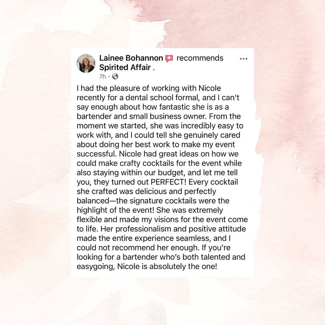 From the moment we booked Spirited Affair for our wedding bar services, Nichole was a true professional. Her communication was always prompt and clear, putting us at ease throughout the planning process. On the day of, the Spirited Affair team handled everything seamlessly, allowing us to simply enjoy the moment. The drinks they crafted were truly amazing - delicious, artisanal mocktails that our guests raved about. Nichole made the bar service feel personal and tailored to our special day. The value she provided was incredible given the high quality of her work. We couldn't recommend Spirited Affair more highly for any couple looking for amazing bar services for their wedding.