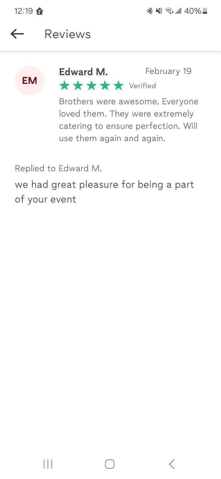 my name is George. I am 27 years old. I have around 6 to 7 years of experience in banquets Event and bartending. I have met so many clients and was truly appreciative of being a part of their event, wedding, and company party. my brother Name Fouad. he is 23 years old. He has worked with me on some events, and wedding. we always met all our clients' needs in success. we always love our job to be smooth and we are very flexible to meet our client's need. We always go above and beyond for our client; we try to make our clients time always special, because it is our number 1 priority.