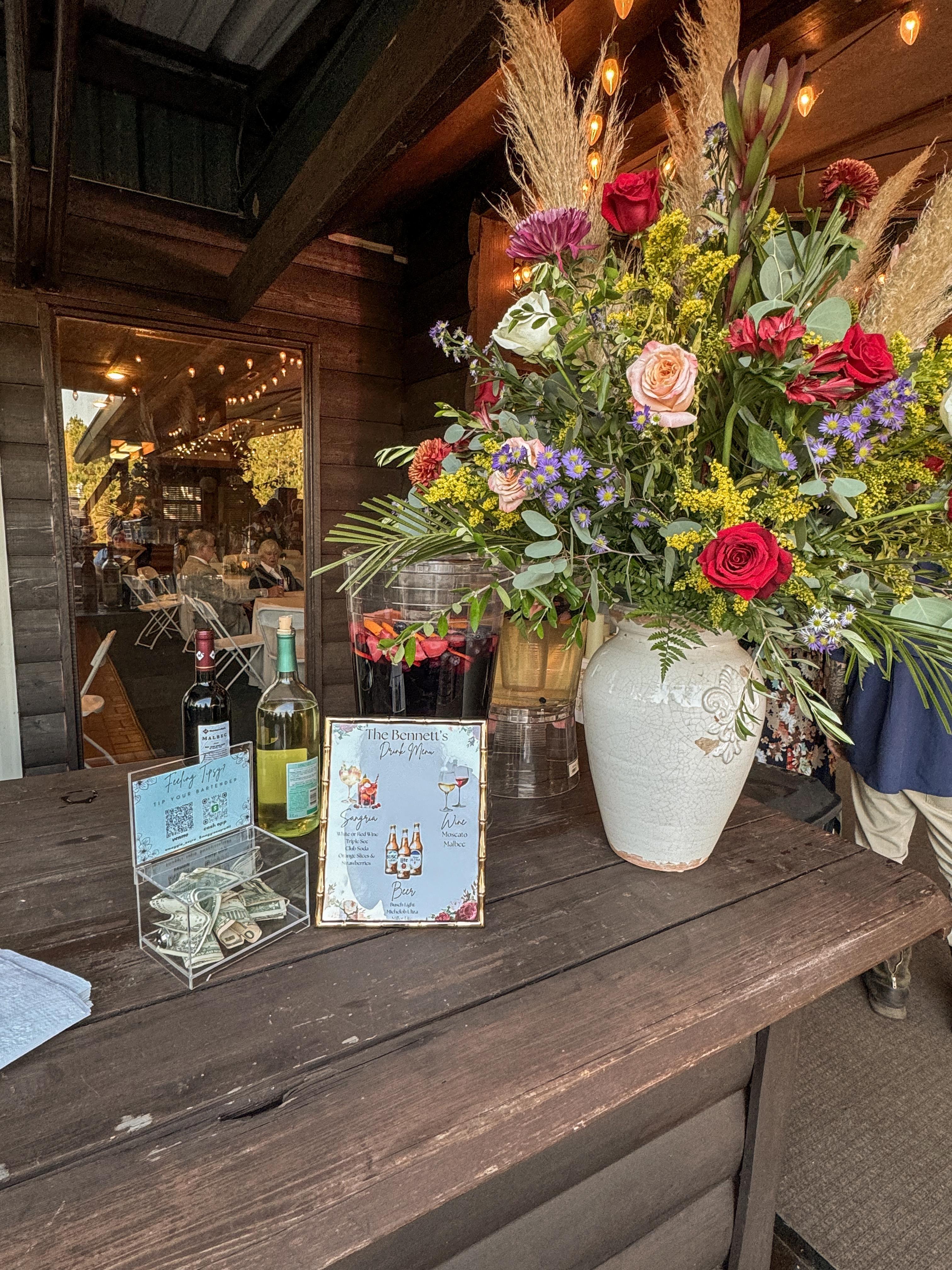 -2 Bartenders -Mobile Bar -Up to 3 Signature Cocktails -Up to 6 hours of service (can be longer for a fee) -Beer, Seltzer, and/or Wine Service -Garnishes, mixers, cups, ice included -Setup and Breakdown/Cleanup provided **Alcohol not included. You will be responsible for purchasing alcohol (we can help guide you on how much to purchase) We have some basic decorations for the bar but feel free to decorate it with whatever fits your wedding style!