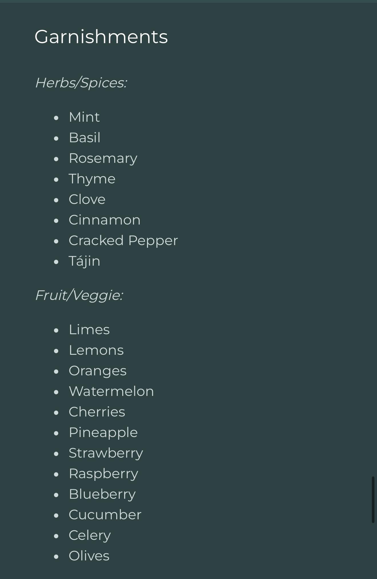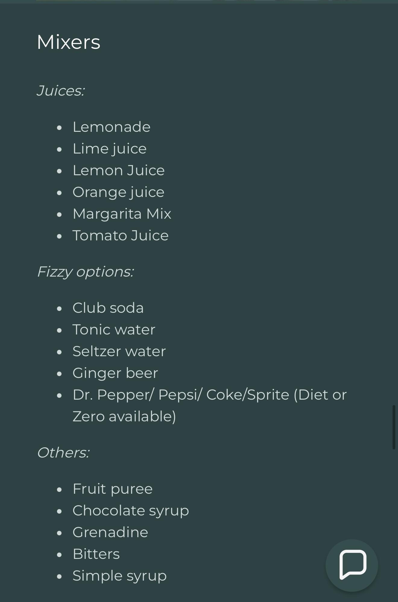 - Mixers/non-alcoholic options