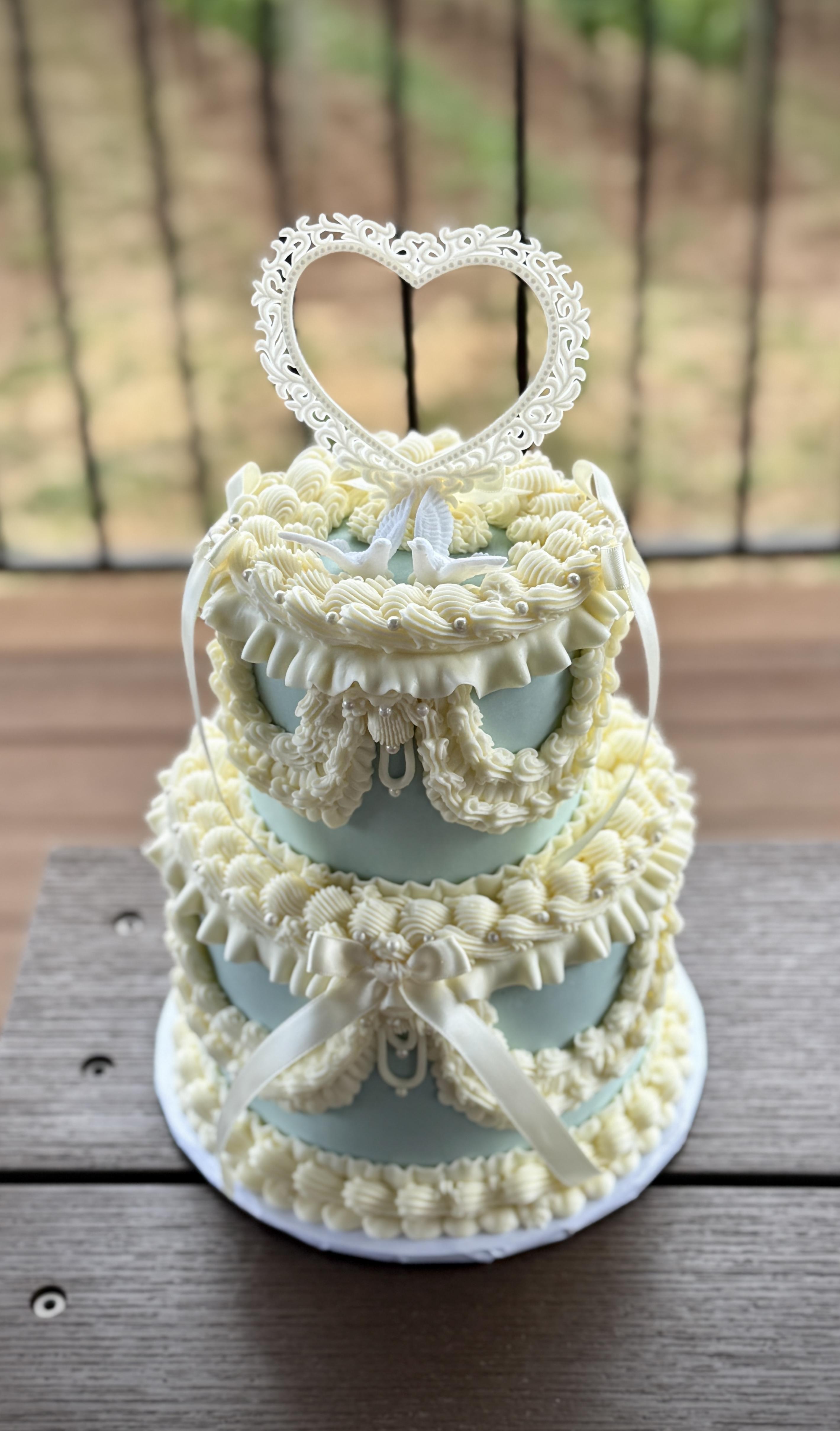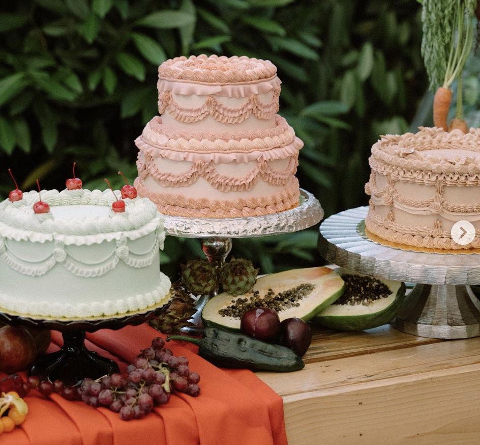 We ordered our wedding cakes from alchemy and they were so so beautiful! We got a 3 tiered blue one with white piping and bright red maraschino cherries and a mini vegan yellow heart with white piping and they were so cute and delish! Like truly jaw-dropping made all my vintage wedding dreams come true!