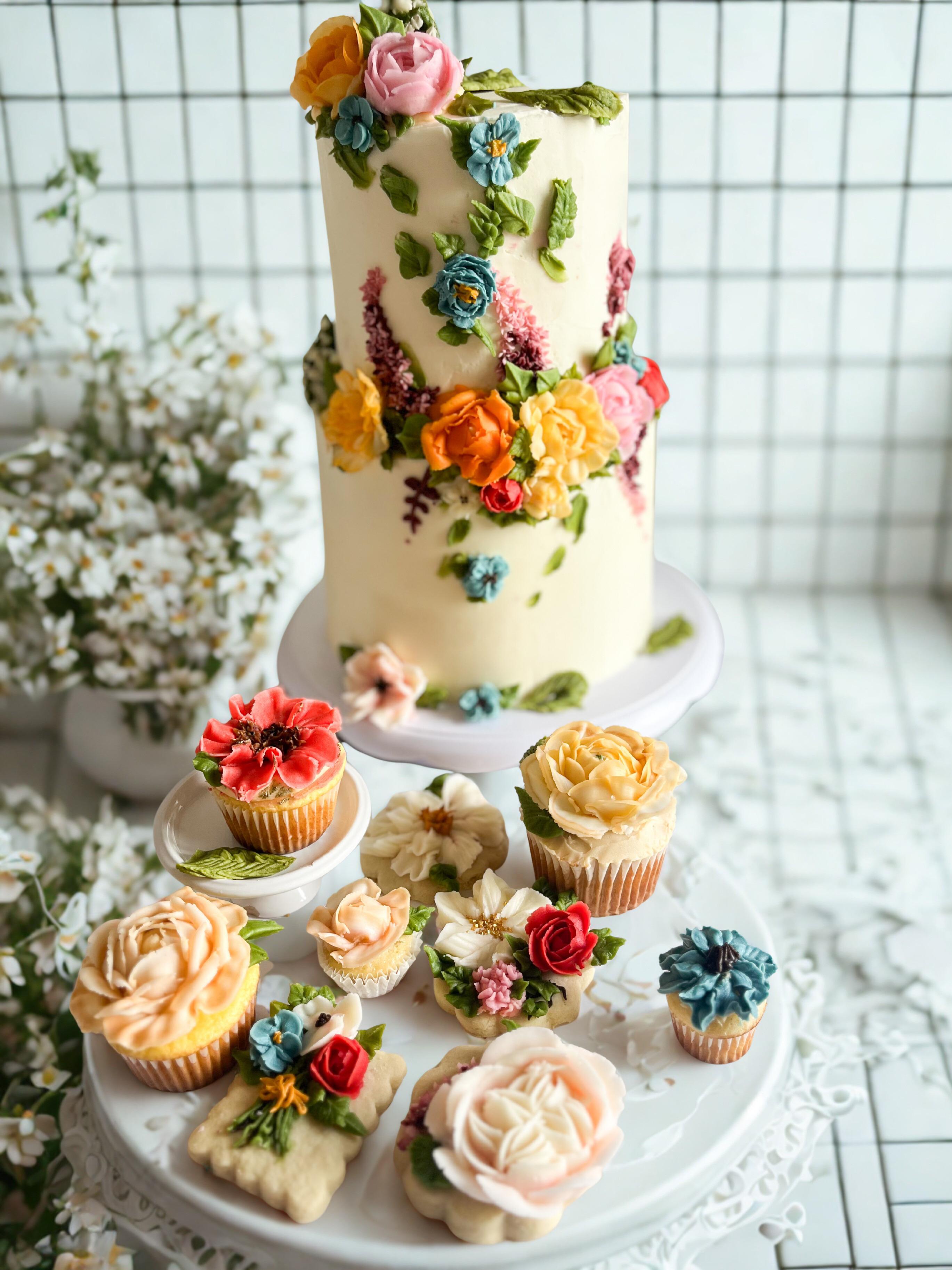 A balanced blend of beauty and flavor, perfect for mid-sized weddings. This package includes a curated mix of mini and regular cupcakes, floral sugar cookies, and a stunning 2-tier cake. It’s designed to delight your guests with elegance and variety while highlighting your event’s theme. Includes your choice of up to 3 flavors. Delivery and setup available for an additional fee.