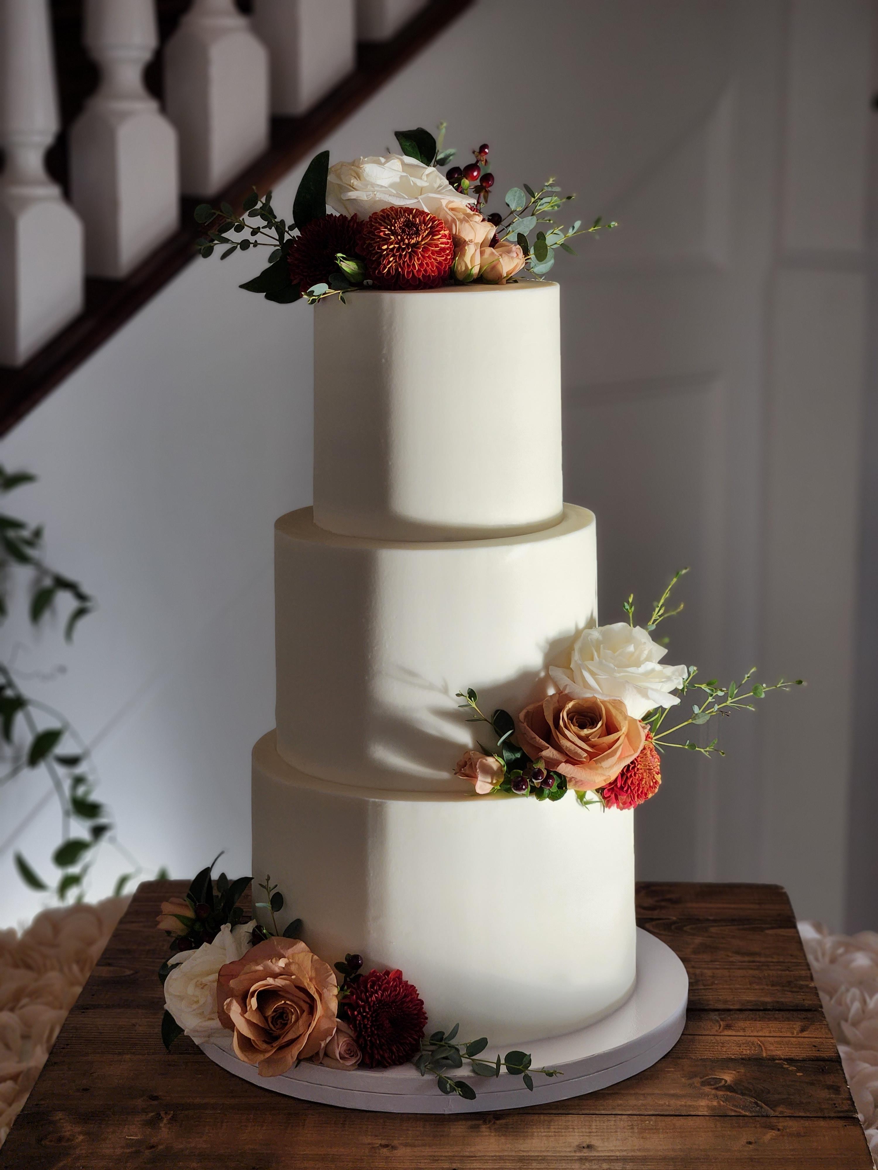 I've been decorating cakes for over 10yrs now. I can't imagine doing anything else. Being able to be part of people's celebrations means a lot to me. I specialize in buttercream style cakes and decorated sugar cookies. I don't offer cakes covered in fondant or shaped cakes. I would love to help create a one of a kind art piece for your wedding.