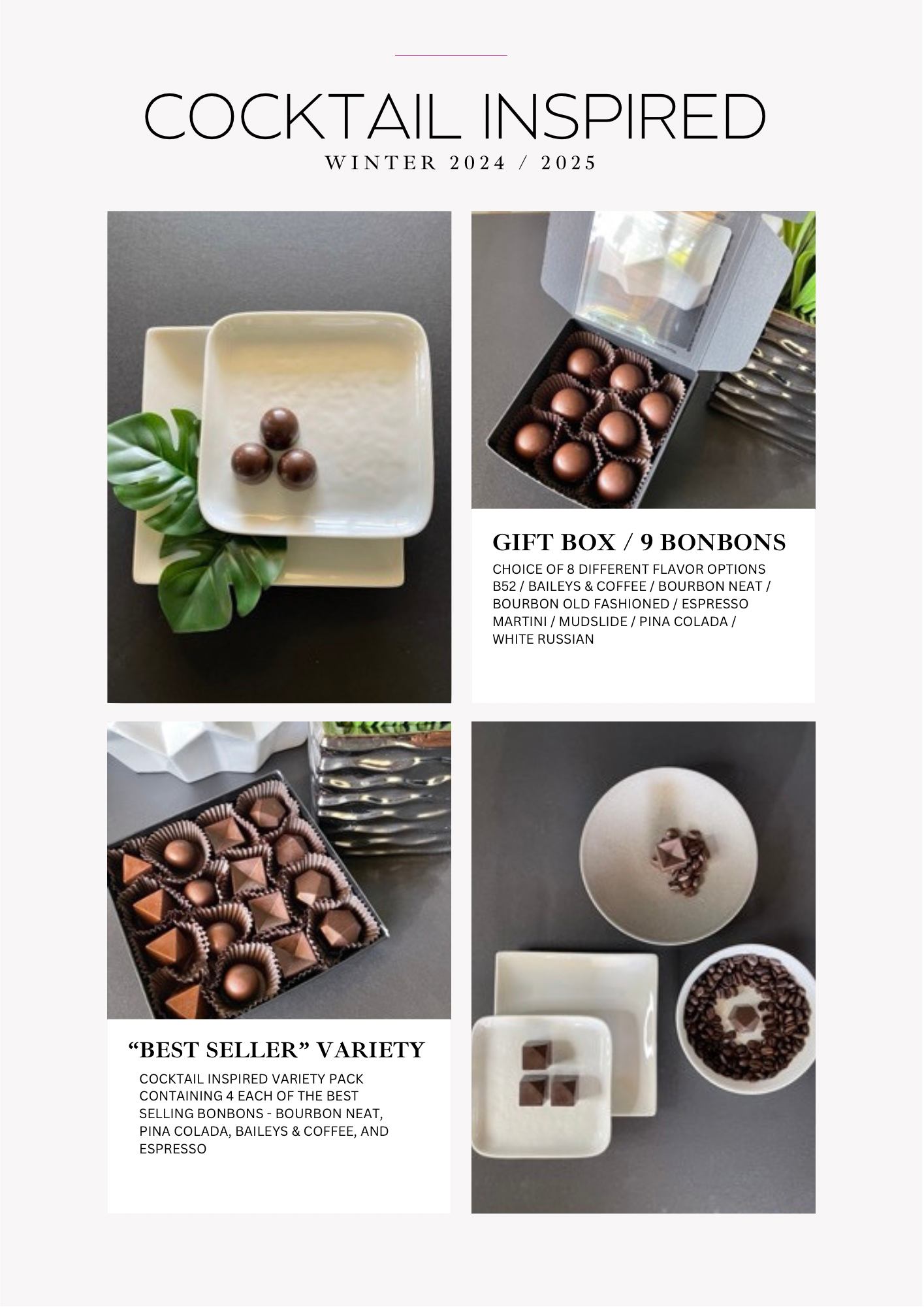 Now, I find myself on an exciting journey, continually innovating and expanding my repertoire of confections. From cocktail-inspired bonbons to espresso bombs and more, I'm dedicated to crafting one-of-a-kind flavor experiences that leave a lasting impression on your palate.
