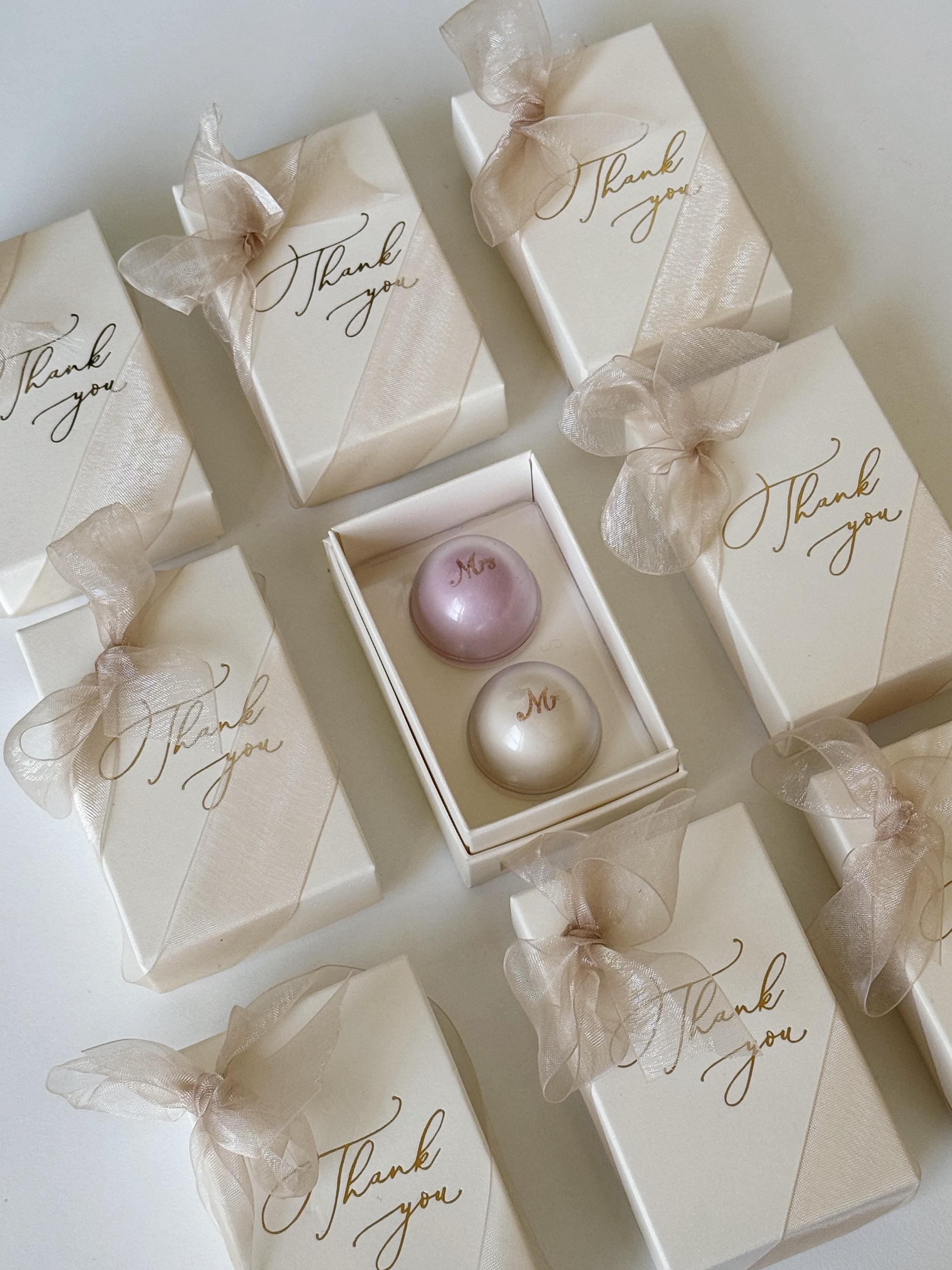 We use the absolute finest ingredients to expertly curate our luxury hand painted bonbons such as Belgium chocolate, natural fruit purée and fresh organic herbs. Beautiful packaging and gold engraving of “Mr” and “Mrs” will amaze all of your guests and will make this little treat absolutely special!