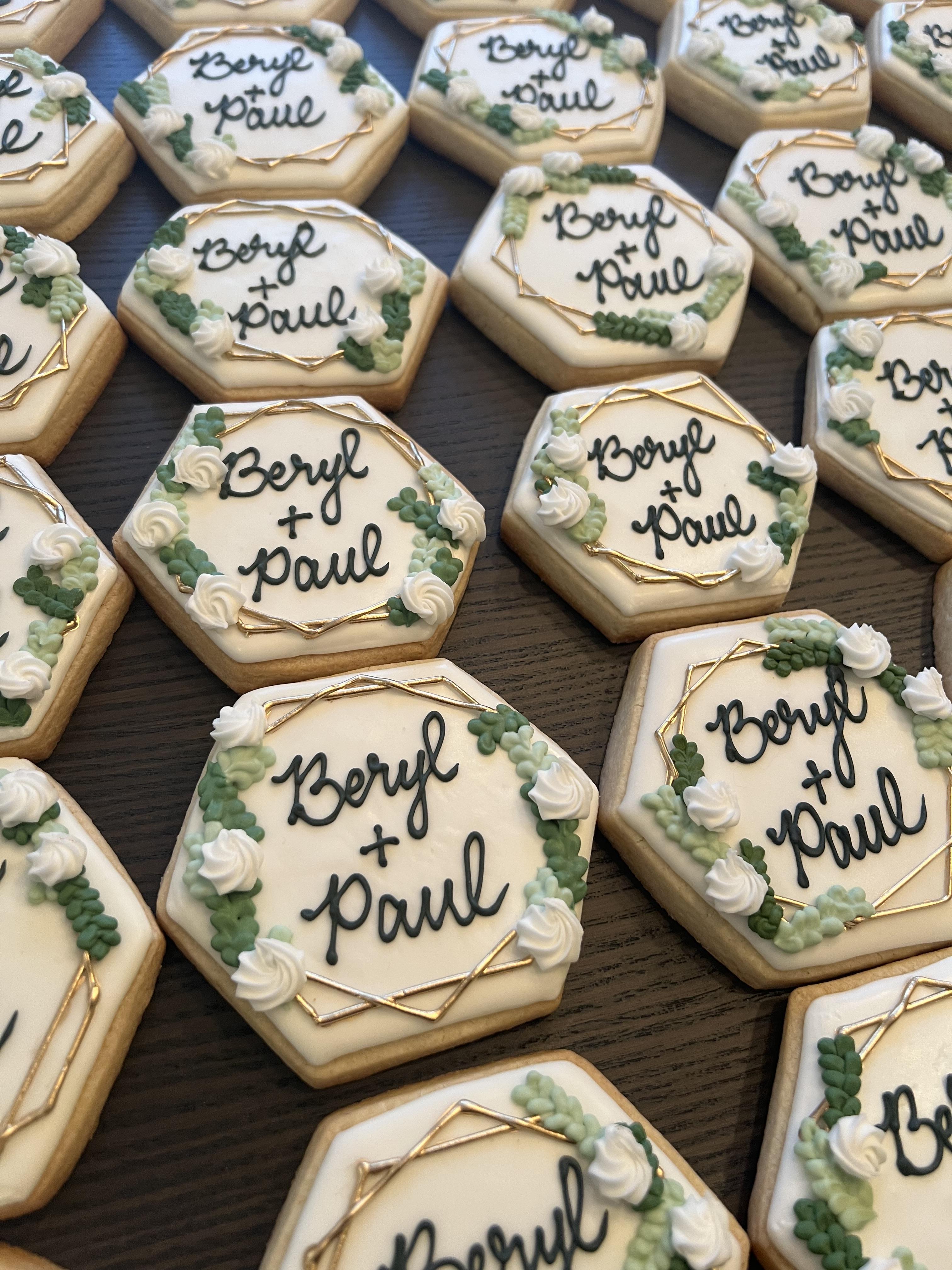 Each cookie is baked fresh and hand decorated to create an edible piece of artwork! We also offer a variety of cookie flavors, so that your cookies are not only beautiful but taste amazing too! We can customize to fit any theme, whether it be a hand piped design, or a customized sticker to match your invitation!