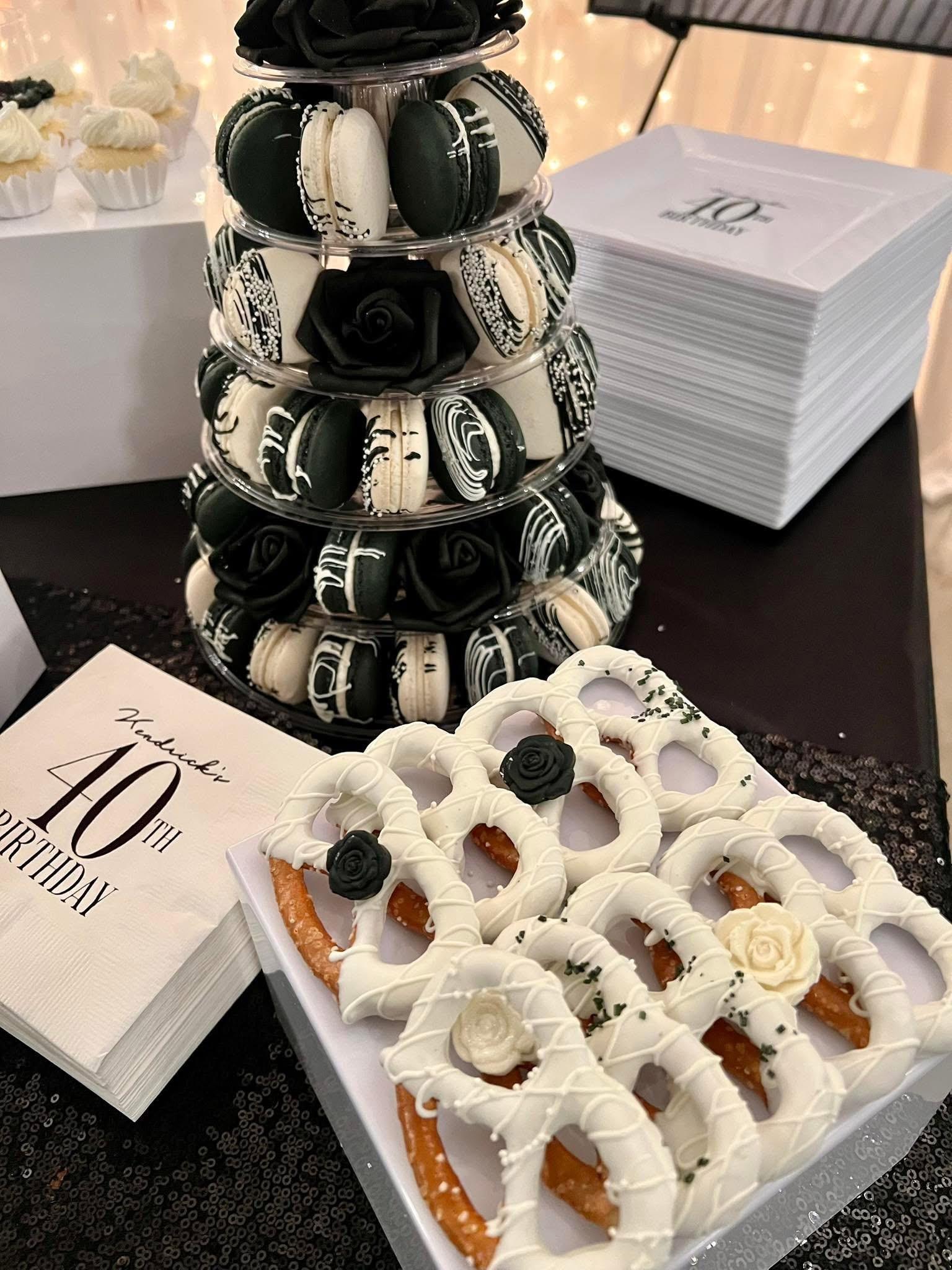 4-Tier Custom Wedding Cake (Serves 100-125, includes floral details & metallic accents) 10 Dozen Custom Treats (Luxury selection: cakesicles, cake donuts, chocolate-covered treats, macarons, and more!) 3 Dozen Custom Cookies (Highly detailed monograms, edible metallics, or florals). Upgrades (add'l fee): Additional cake servings, edible gold, hand-painted details ~Servings: 150-200 Guests