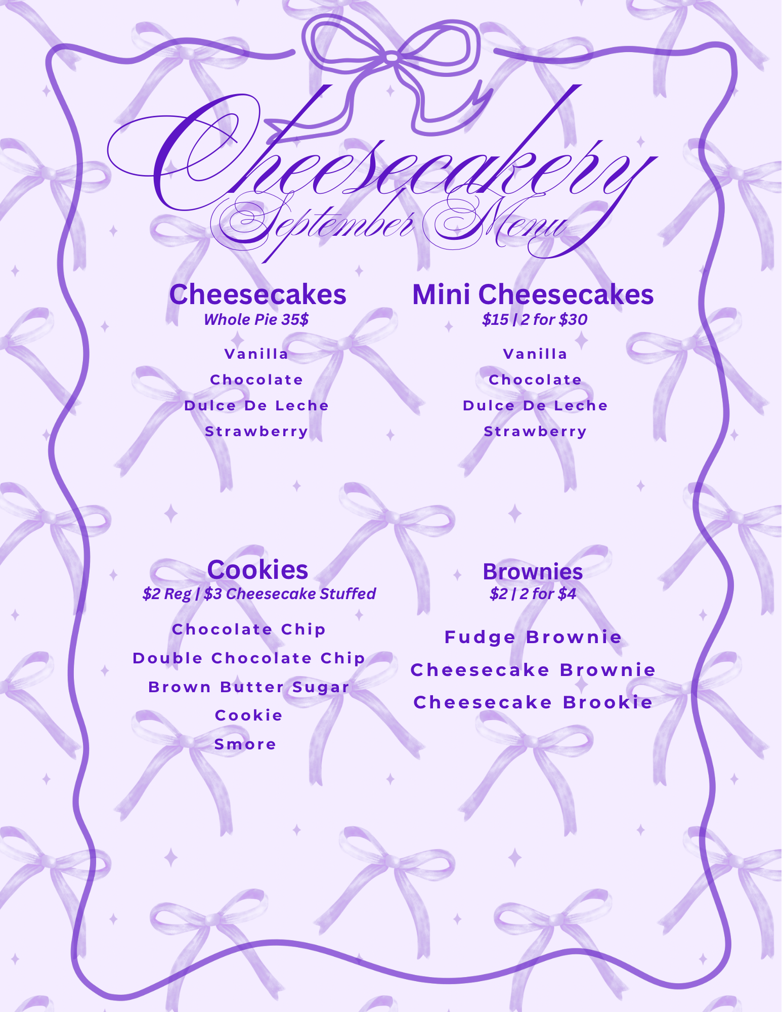 🍬 Dessert Table Packages Take the stress off planning—let us create a full spread! We also do Customizations! 💡 Add-Ons Custom Labels (weddings, monograms, logos): +$25 Delivery & Setup: starting at $50 Cheesecake Shots (mini shooter cups for cocktail hour): $2.50 each Individually Wrapped Cookies or Brownies (great for favors): +$10 per dozen
