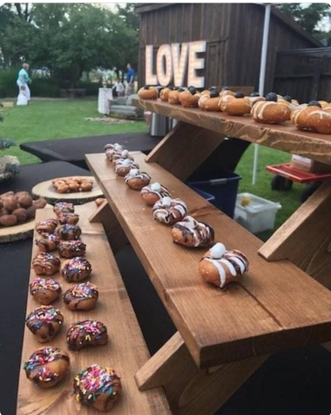 We do fresh, same-day, mini funnel cake-style doughnuts! Fried to perfection! We have unlimited options as far as getting doughnuts to you! Whether you want them made on-site or displayed on-site. We will make your dreams come true!