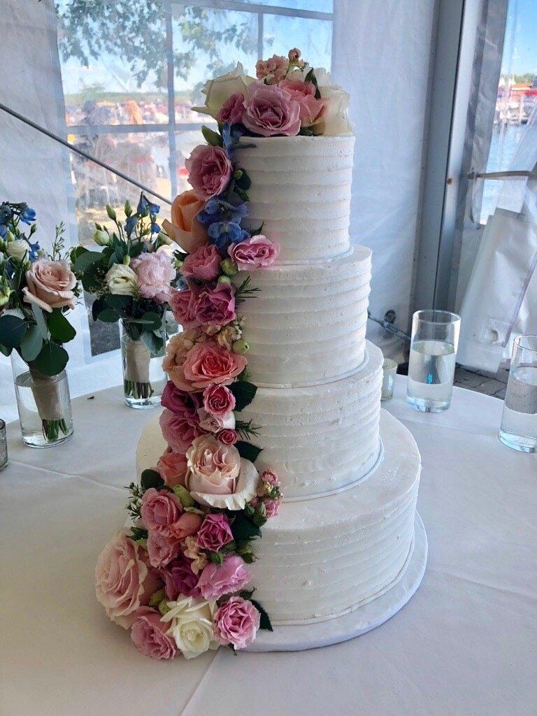 We live in Texas so we only had a few chances to try some of the more popular bakeries in the area, and honestly weren’t blown away. We relied on the reviews and input from the Rochester Wedding Connections Facebook group to help us narrow down who we’d go with. From there, we decided to go with Gourmet Goodies in Victor. I worked with Debra on a 4 tier naked-ish cake as well as a surprise grooms cake. Debra was amazing to work with! We were able to select 4 flavors with varying center flavors for each tier. We saved the top tier of our cake for our first anniversary, and we’re so looking forward to that! She also has a florist she works with and she was able to provide flowers on and around the cake, as well as edible gold flakes (since we are the Golds). I also purchased a small cat and dog figurine so we could have our pets be part of our day, as well as a cake topper. When I made the final deposit, I provided these items to Debra and she added them to our tiered cake, exactly where I wanted them. For the groom’s cake, Debra took my idea and ran with it and it was AMAZING! My husband loves the Philadelphia Eagles and our dog, so she made a football field with an edible printed photo of our dog in an Eagles jersey. This was SO fun and one of the highlights of the day! The cake was delicious!!! We had carrot cake, marble, vanilla wedding cake, and chocolate. The carrot and marble cake went first and we only had a little bit of the chocolate and vanilla wedding cake leftover which we devoured in the following days. I cannot wait for our anniversary so we can try the red velvet!!! The pricing was reasonable and actually was cheaper than we budgeted for which was great! The bakery is only a few minutes away from our venue so that was extremely convenient and she was able to easily deliver everything day of.
