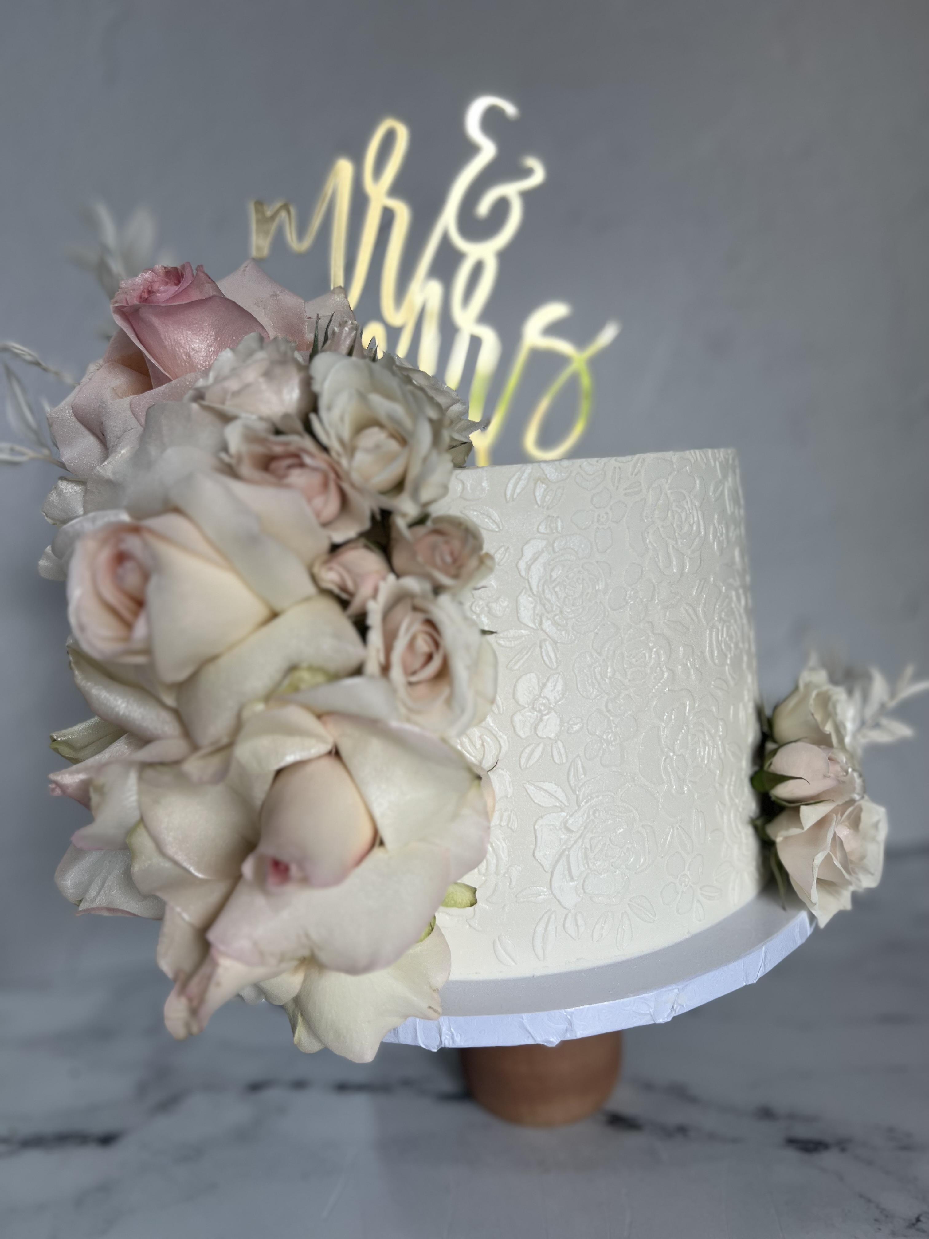 1 cake, 2 tiers for 40 servings. Choice of 2 cake flavors and 2 cake fillings. Acrylic monogram included. Decorated with Fresh flowers Delivery fee applies
