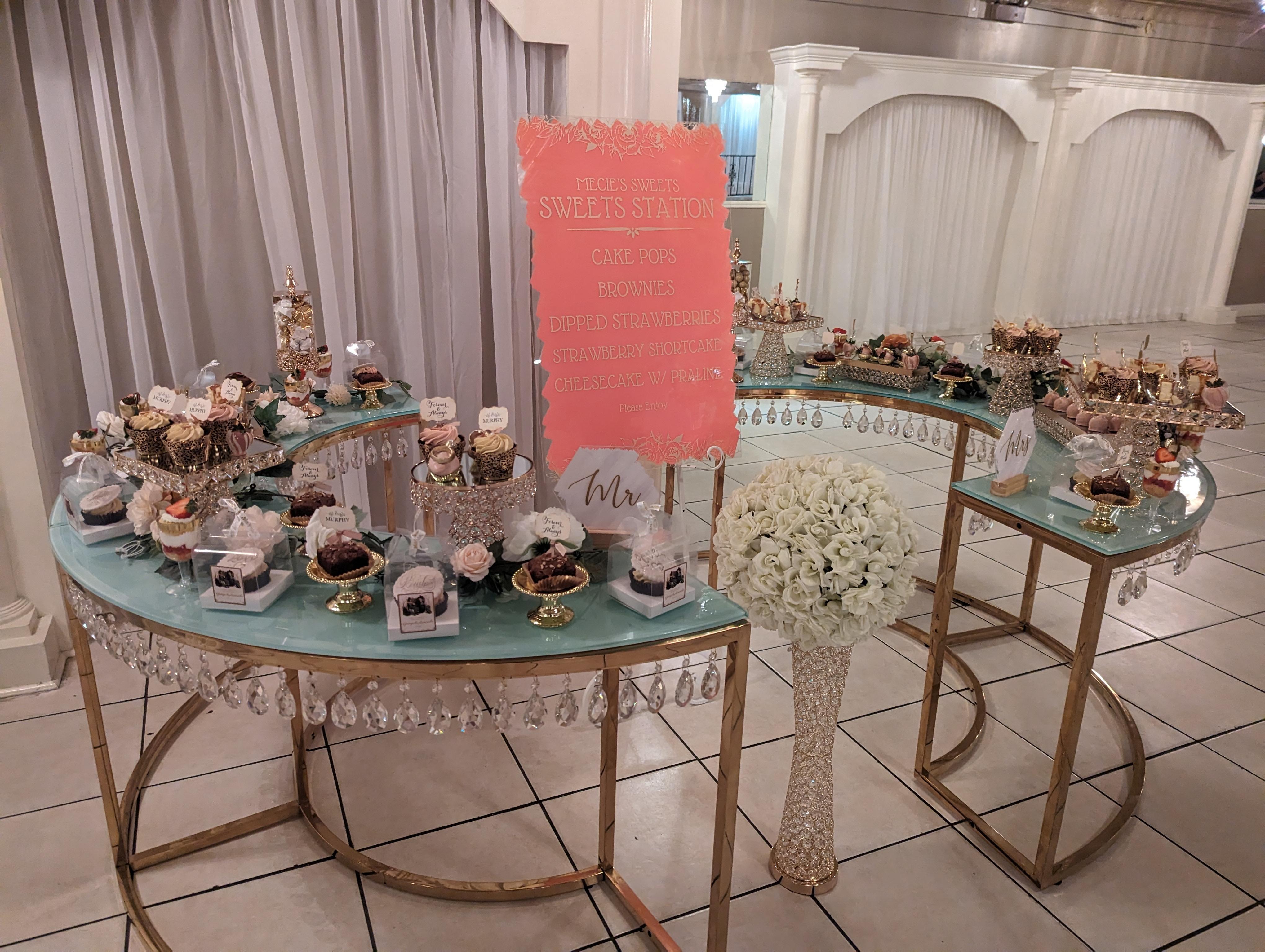 * Includes: Table decor, Accent platters and stands to match decor , 3-5 candy jars (5) dozen treats of your choice * Includes pickup of items from table .. reservations include Baton Rouge and local areas. Outside BR area will be subject to additional travel fee Custom design on treats and desserts such as: cakescicles, cupcakes, cheesecake shooters and other dipped treats