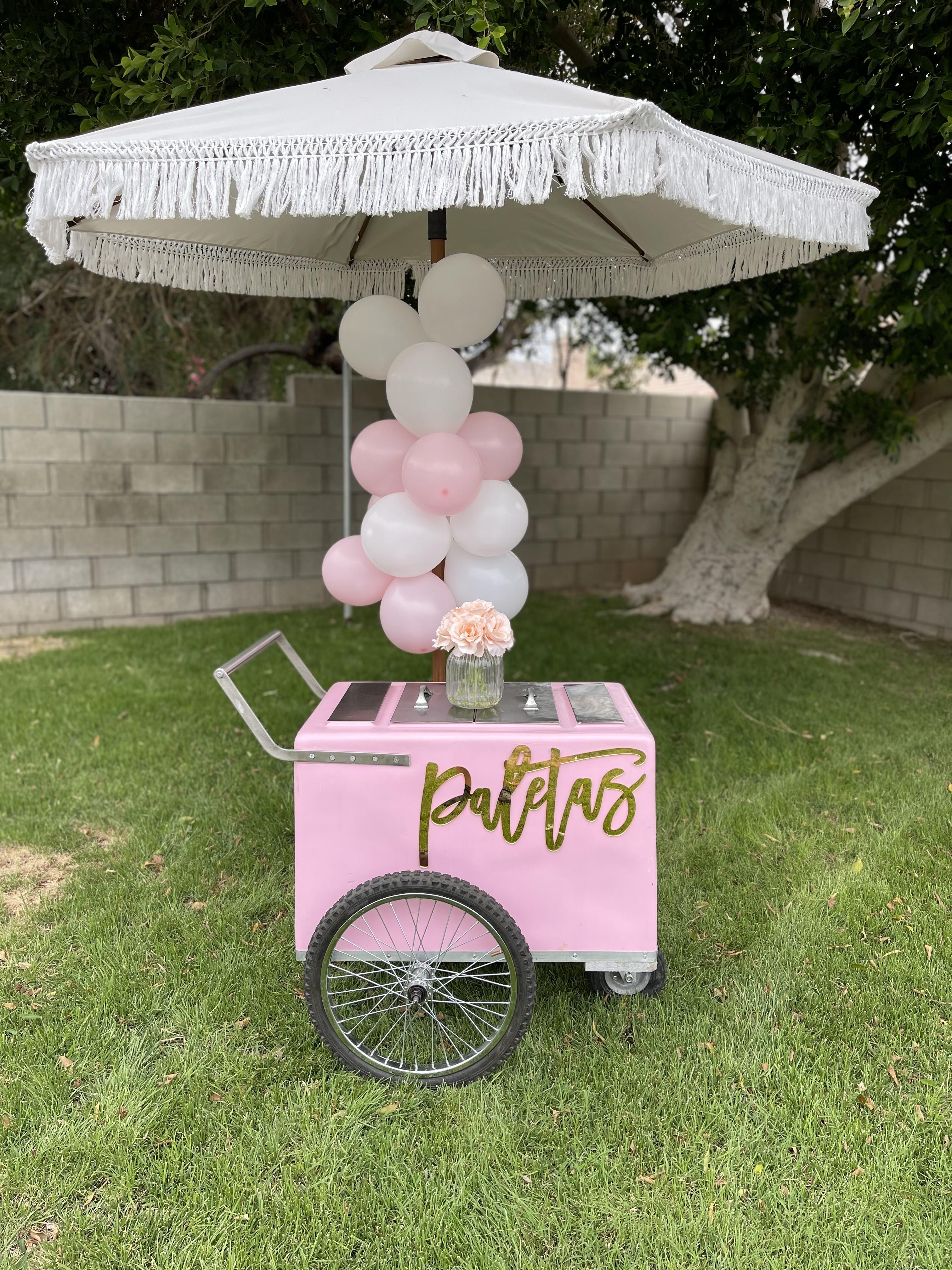 Welcome. "Palm Springs Paletas is a locally owned family business. We carry 4 colors of ice cream carts Blue, Pink, white & yellowAll our ice cream is handcrafted and made to order we carry over 25 flavorsAuthentic Mexican flavors, custom & dairy, and non-dairy flavors available This is the perfect addition to any event"