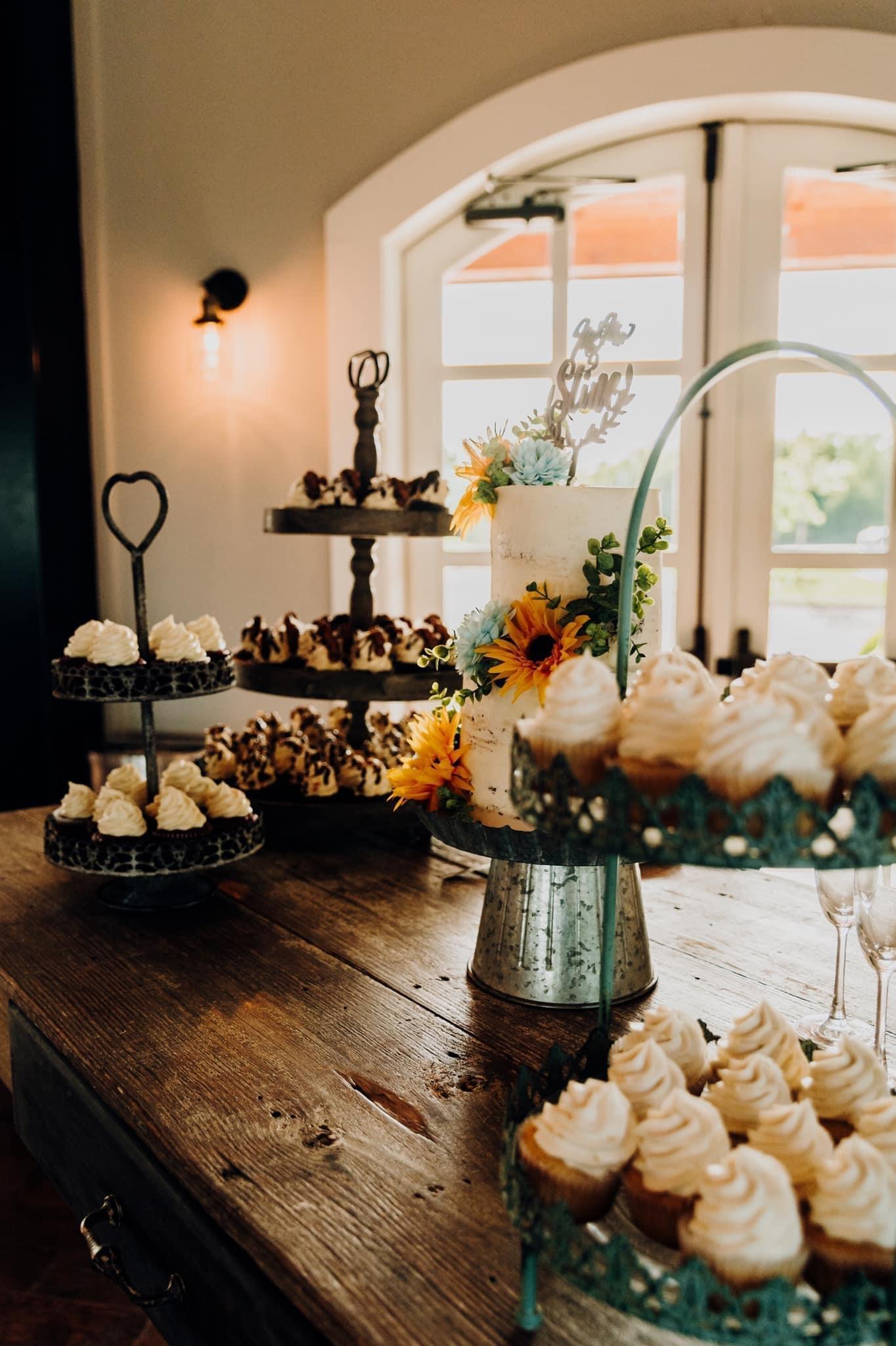 The bronze dessert table will feed about 100 guests and includes a simple wedding cake design.