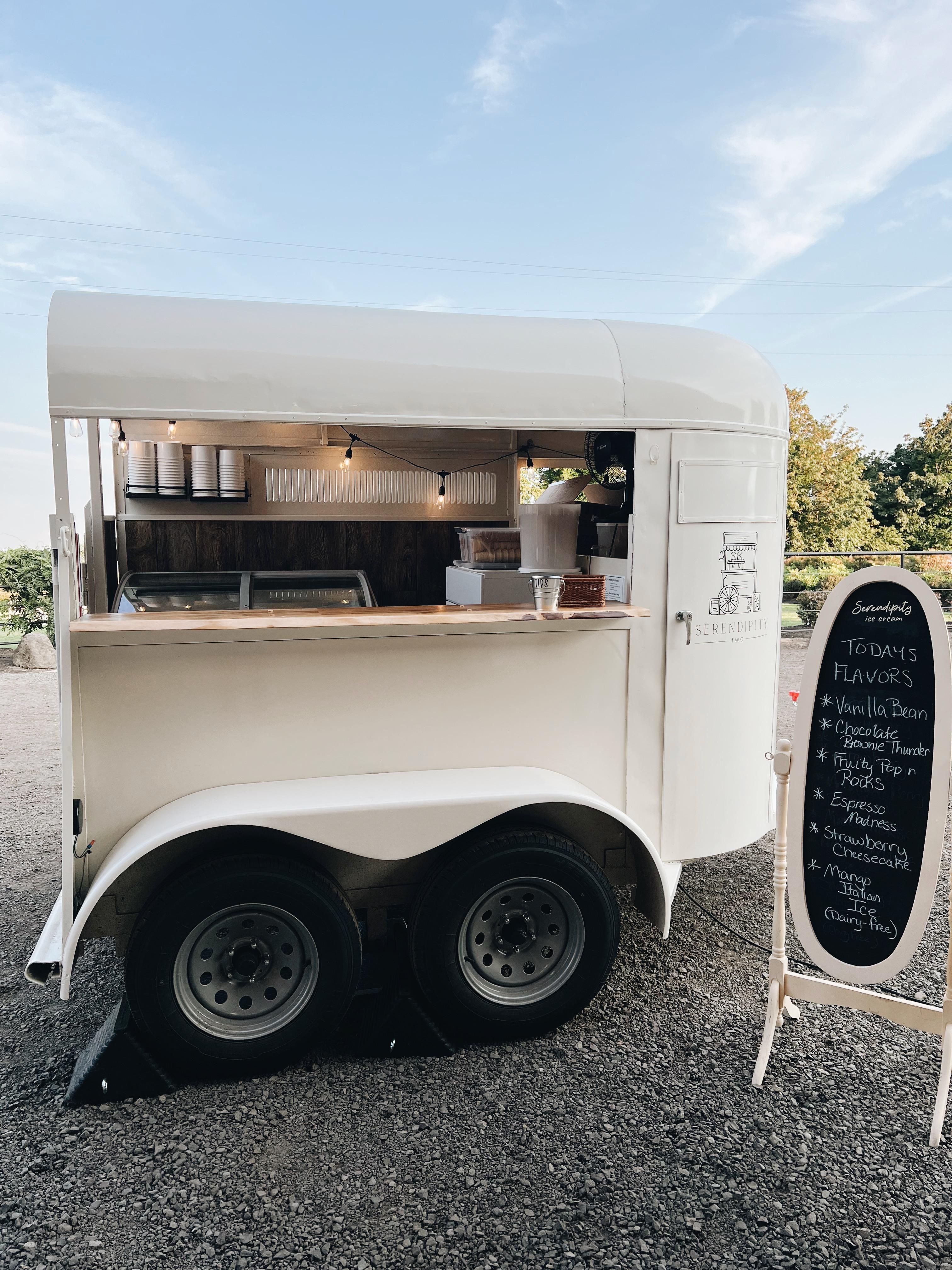 We renovated and restored and 80s horse trailer to serve ice cream & more out of. There is nothing more unique than ice cream coming out of a horse trailer! We also painted the trailer cream so that you can dress up the trailer any way you want it!