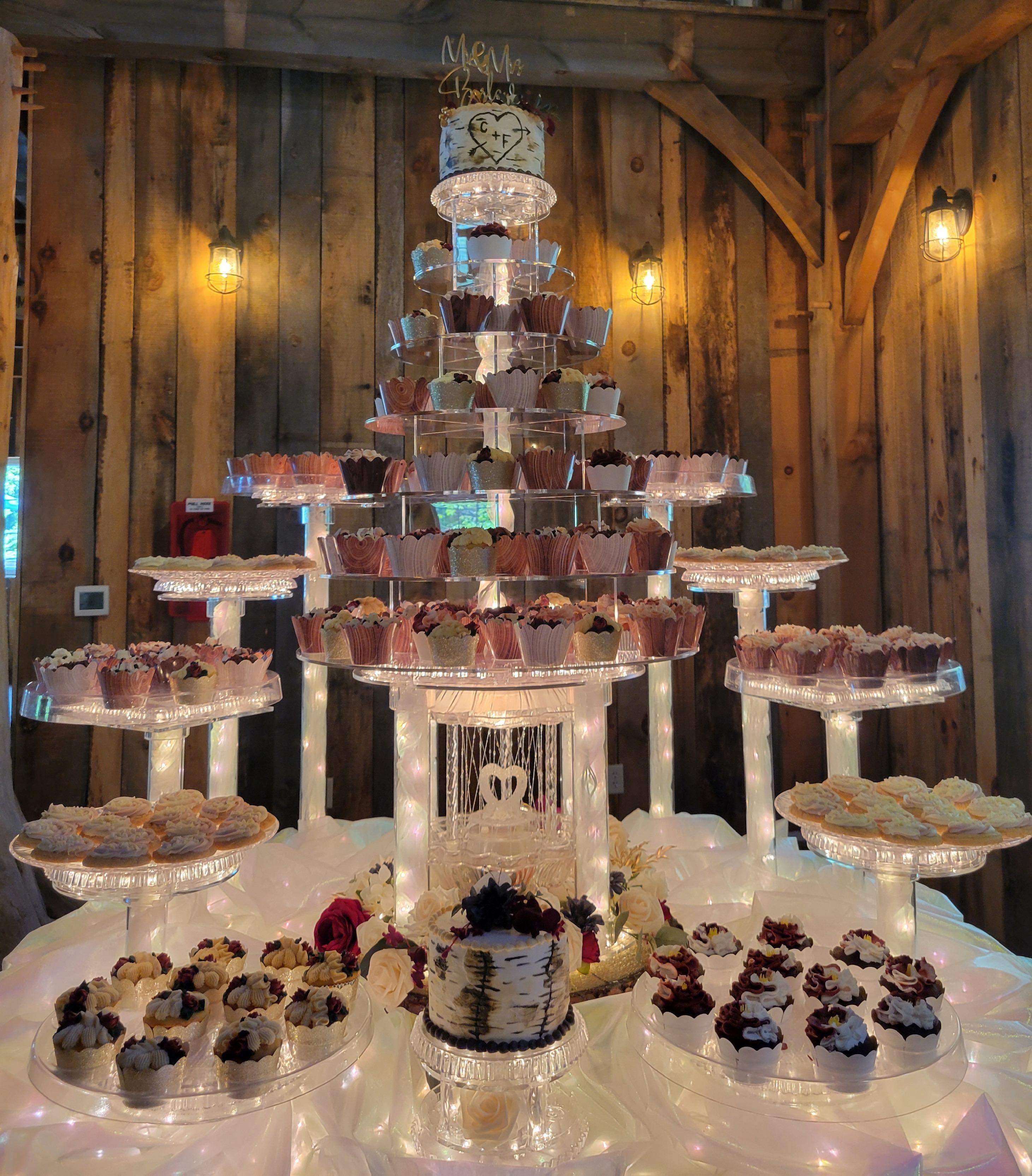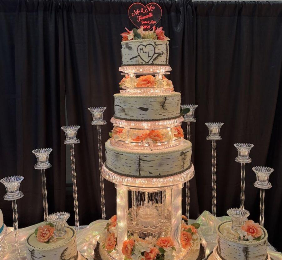 Our ever changing cake gallery now boasts between 20-30 wedding cakes on display. We continue to grow by improving and creating new products that enhance our wedding cakes. We deliver thru out Wisconsin with the goal to leave brides speechless upon seeing their wedding cake. We take great pride in our family business and make everything with love ensuring great taste, fantastic freshness, elegance and beauty. Your wedding cake will create the WOW factor, being a highlight of your reception! Our illuminated cake stands remain lite on the table all evening long, even after the cake is served.