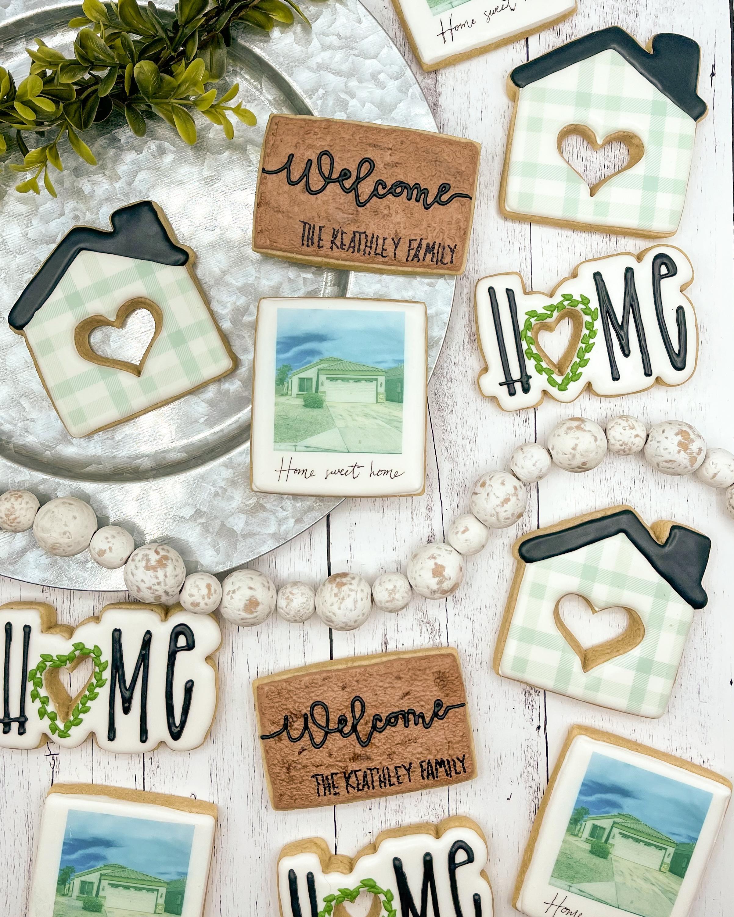 Not only do my cookies look beautiful, but they taste amazing as well! I strive to make each cookie design say a little something about the couple and love including personalized details. This could include recreating logos to include names, showing a significant number or time on a clock, or including a loved pet in the set. I also have the ability to print images directly on cookies for a unique and personalized experience.