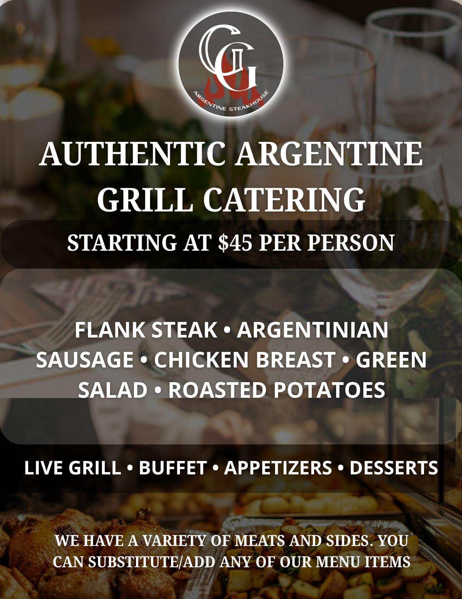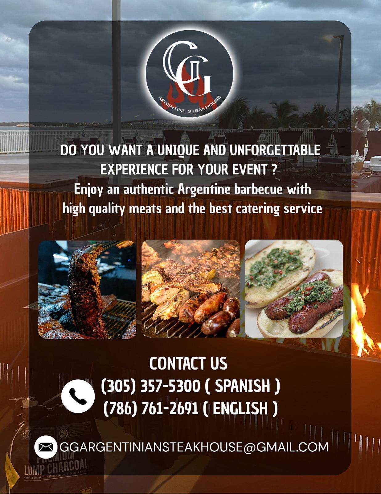 Make your event unforgettable with the authentic flavor of Argentina. GG Steakhouse offers live grill, buffet service, appetizers, and desserts. Perfect for weddings, birthdays, corporate events and more.
