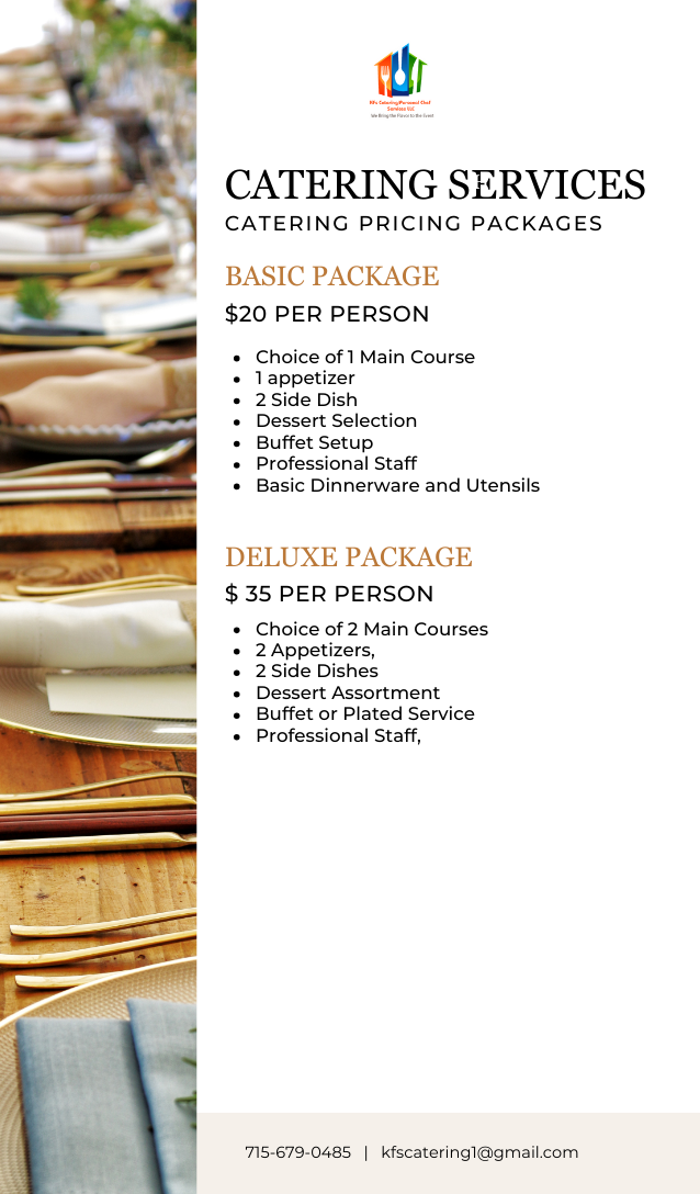 We cater to any budget . We are always looking for new items to add to our menu . No event is too big not too small . With over 30 years in food industry KFS knows what is needed to make a wedding catering unforgettable.
