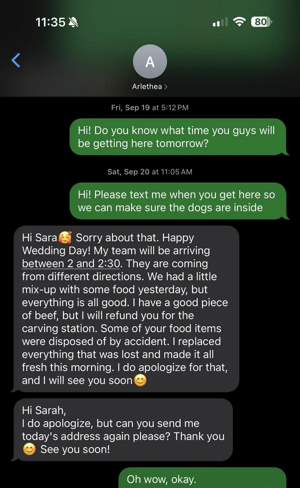 Response from vendor•Oct 17, 2025Hi Sara and John, We value all client feedback and are genuinely sorry to hear that you were dissatisfied with your experience. However, the details shared in this review do not accurately reflect the services provided or the actual sequence of events. Our records, event documentation, and staffing logs—along with photos from your event—show a very different account. For transparency, we have shared a few of those photos here on Zola. Simply Delicious Dishes Catering takes great pride in delivering freshly prepared food, reliable service, and a positive client experience. We stand firmly behind the integrity and professionalism of our work. If you would like to discuss your concerns directly, we welcome the opportunity to do so, and we’ll be glad to review any verifiable issues privately and professionally. Sincerely, Arlethea Battin Simply Delicious Dishes CateringBride