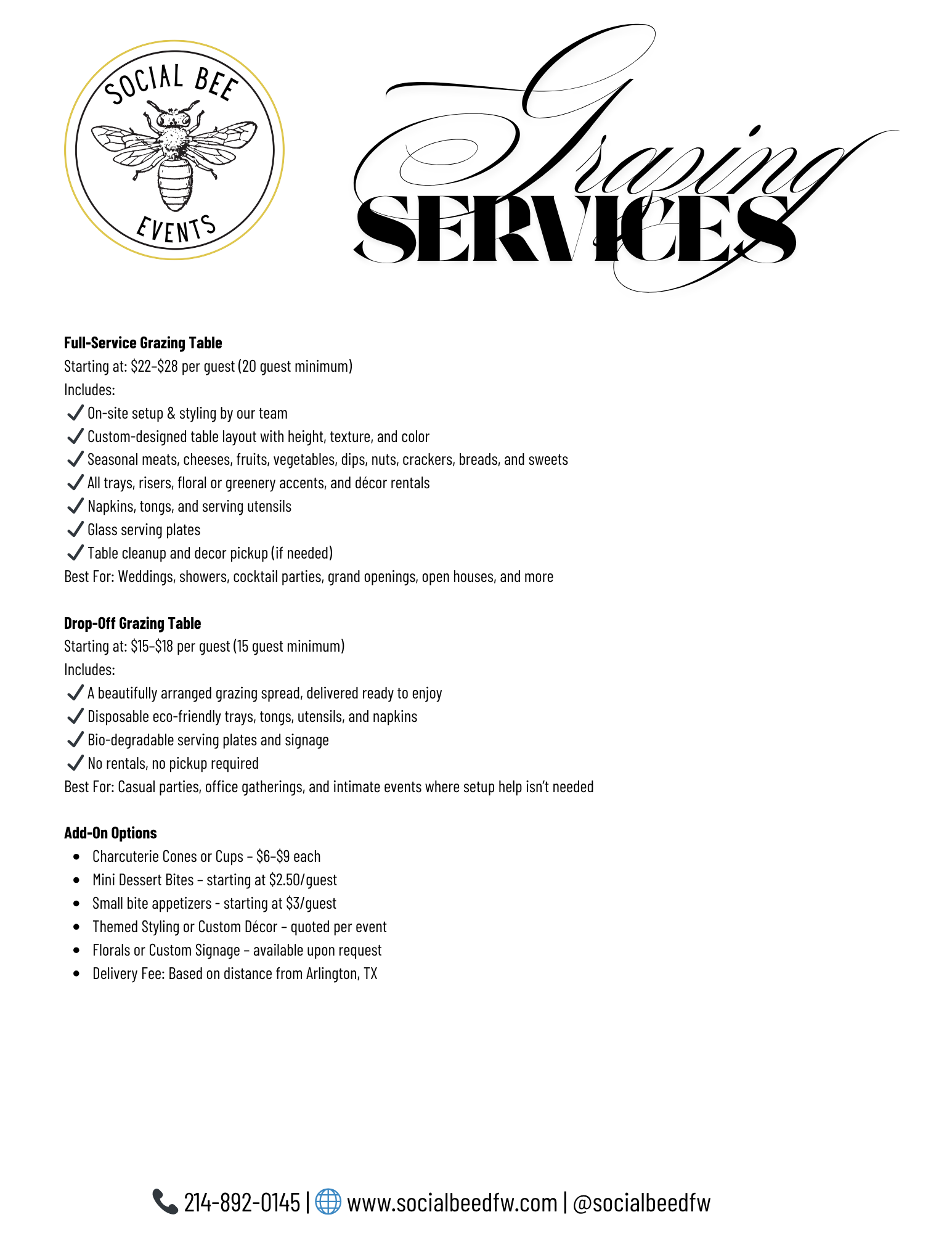 Not your average catering! We specialize in full display sweet & savory grazing tables, charcuterie boards, and small bites. Each artful design is customized to wow at your event. All packages are full service and include decor.